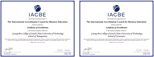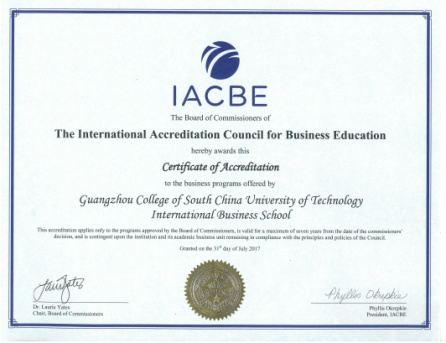 本网讯(记者 陈贤贤、黄卉菁)“IACBE认证委员会非常高兴地宣布,华南理工大学广州学院顺利通过正式会员资格评审,获得IACBE正式会员资格!”7月21日,接IACBE (International Accreditation Council for Business Education,国际商科认证委员会)的正式通知,我校4个申请认证专业——国际经济与贸易、工商管理、市场营销、会计学全部顺利通过认证,我校成为中国第一所获IACBE国际认证会员资格的高等院校!