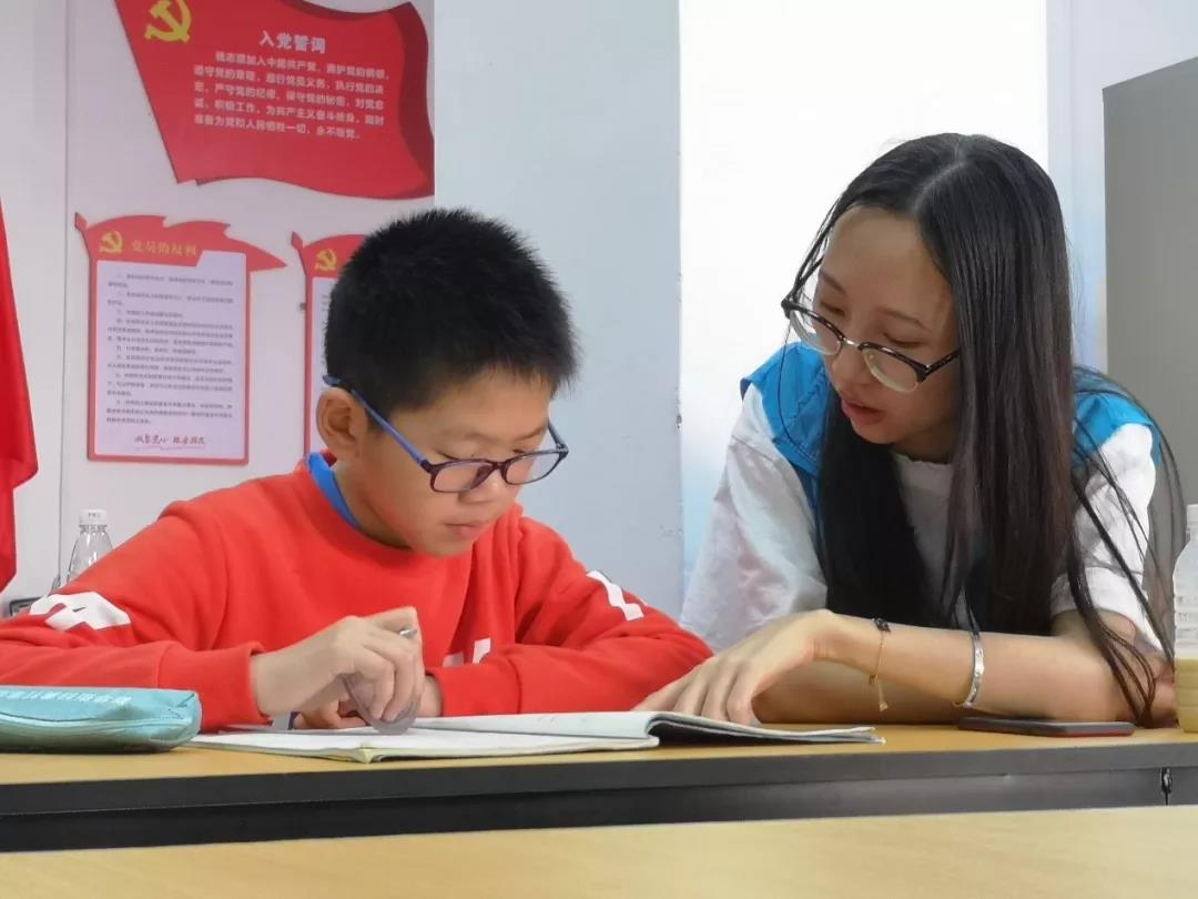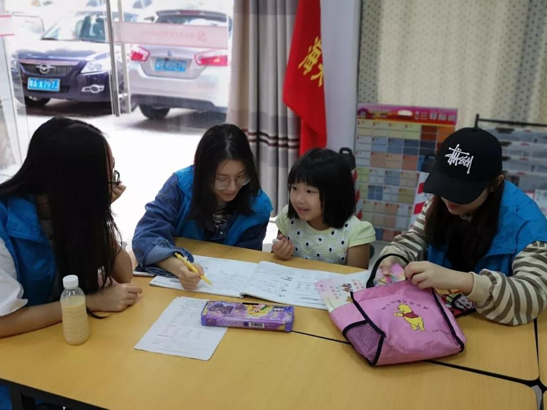 没过多久,又有许多小朋友来到了活动室。小蓝姐姐们陪伴着这位小朋友,细心地为她讲解作业,指出其中的错误,帮助她改正。在不断的相处中,小朋友收获到了知识,也收获了快乐。