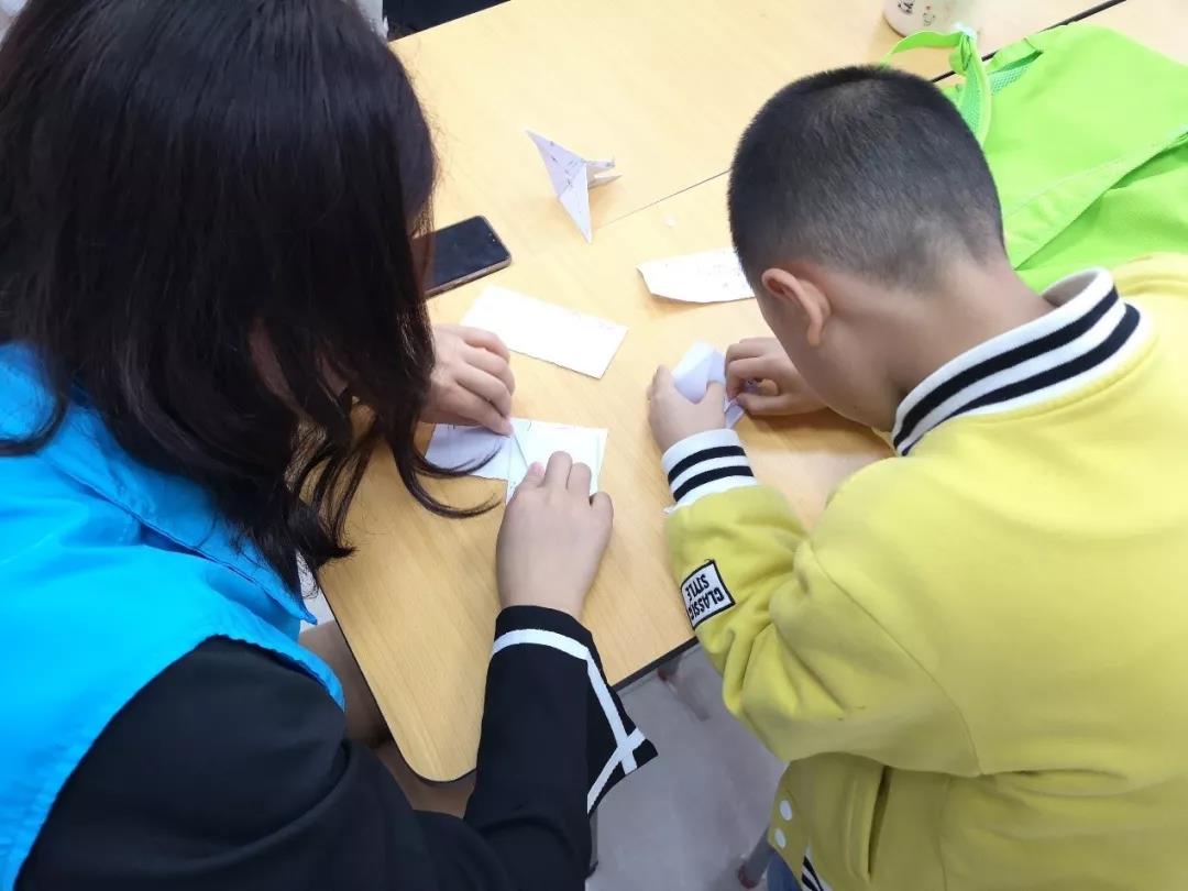 除此之外,小蓝同学还和小朋友一起做起了折纸,小蓝同学一步一步引导着小朋友,看着小朋友们认真的表情,小蓝姐姐露出了笑容。