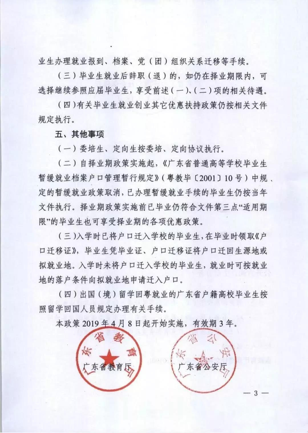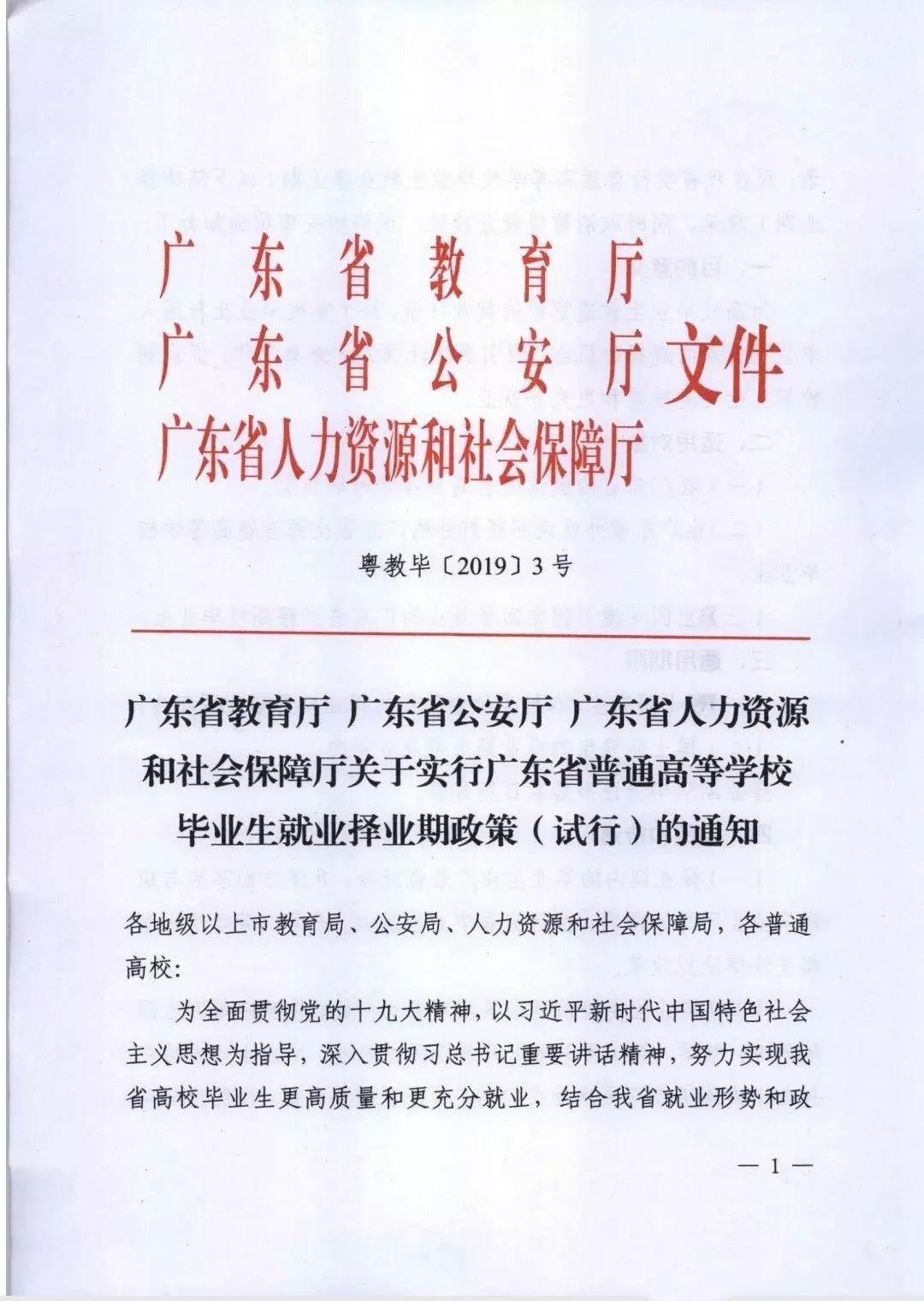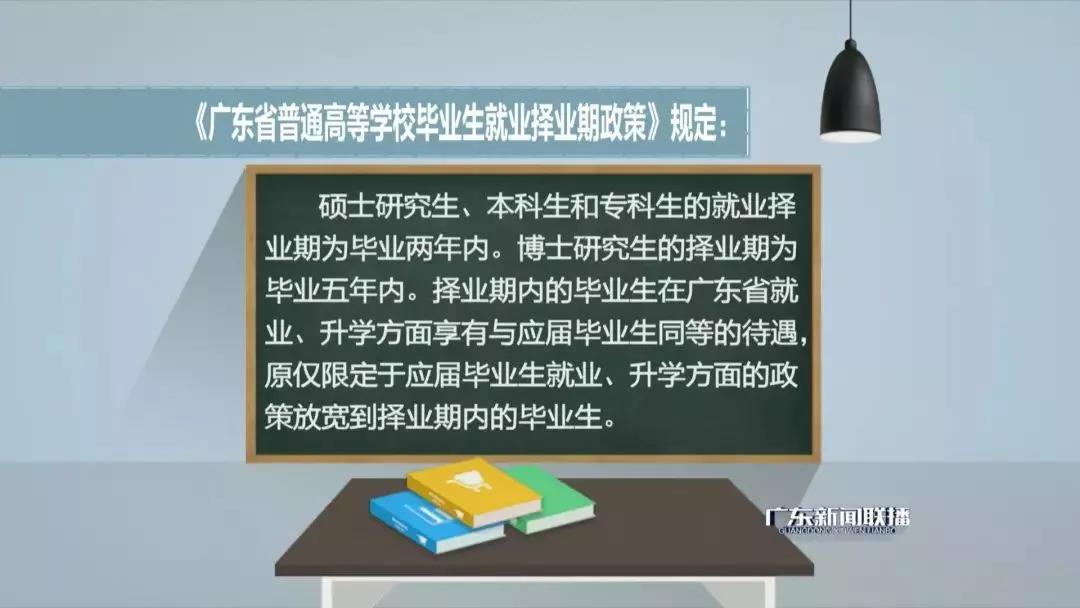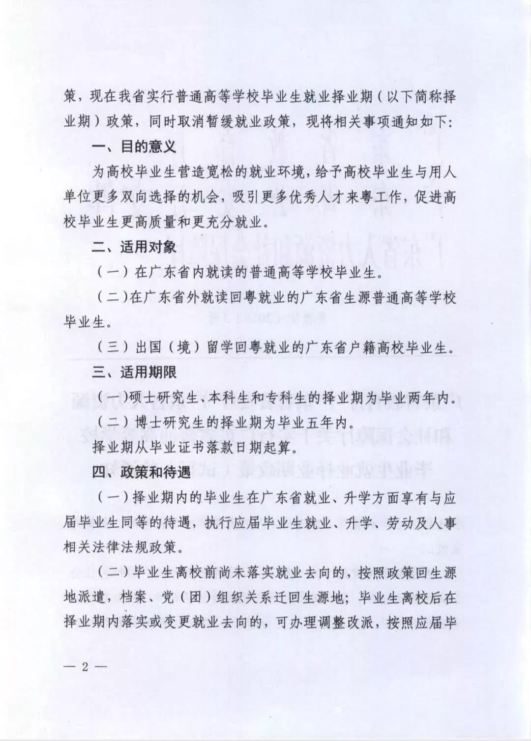 1. “自择业期起政策实施起,取消暂缓就业政策”2. “择业期内的毕业生在广东省就业、升学方面享有与应届毕业生同等的待遇”