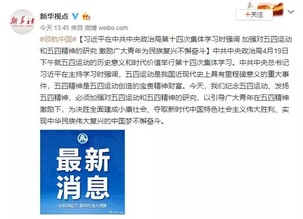 新华社北京4月20日电 中共中央政治局4月19日下午就五四运动的历史意义和时代价值举行第十四次集体学习。