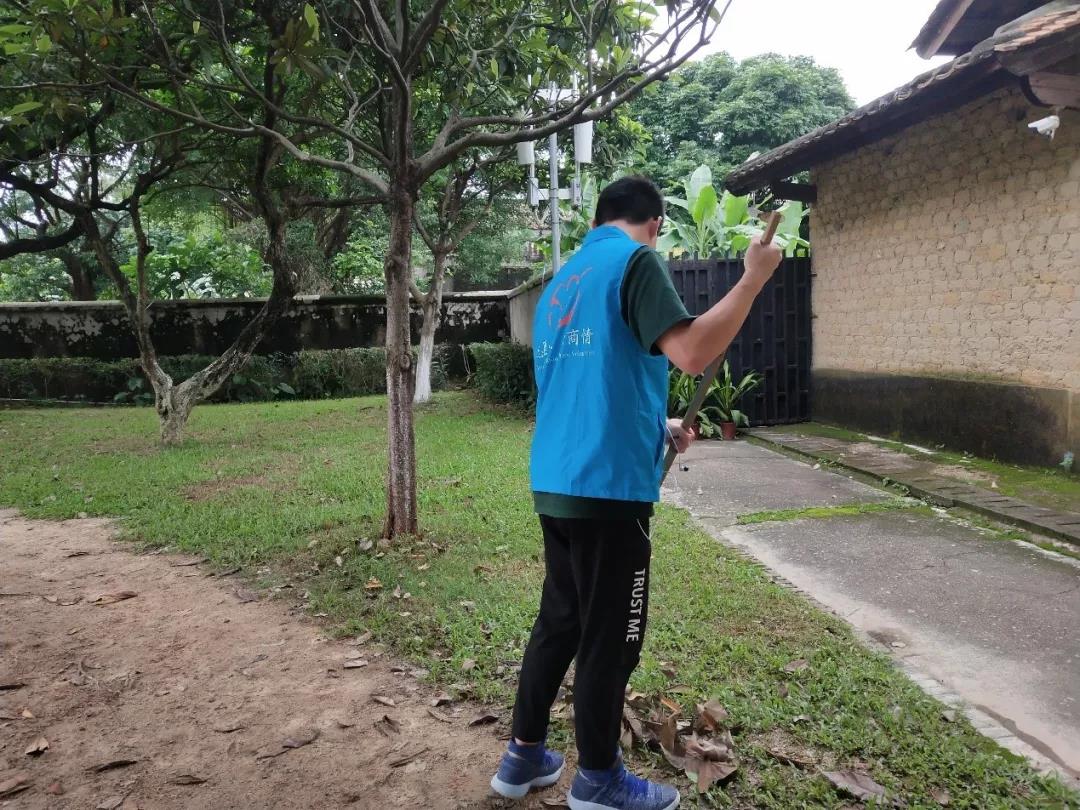 看,这位小蓝同学熟练地披上了蓝色马甲,走到指定的地点开始清洁工作。他认真地将落叶从草丛中扫出,丝毫不放过每一个角落。