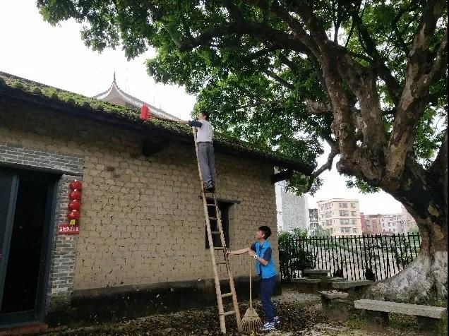 不止是小蓝同学们,故居的清洁人员们也是十分认真,只见他们爬上梯子,用扫把将屋顶上面的落叶扫下。看着落叶不断地被扫下来,小蓝同学们也露出了微笑。