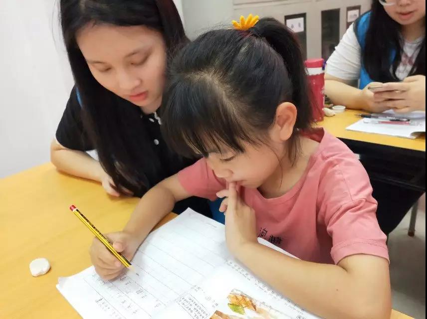 这位三年级的小朋友是第一个到达学习室的,一套行云流水的操作——坐下从书包里拿出课本,小蓝姐姐亲切地迎了上去,听闻这位小朋友是要做语文听写,小蓝姐姐立刻对照着书本上的拼音,准确的念出词语,帮助小朋友完成听写作业。