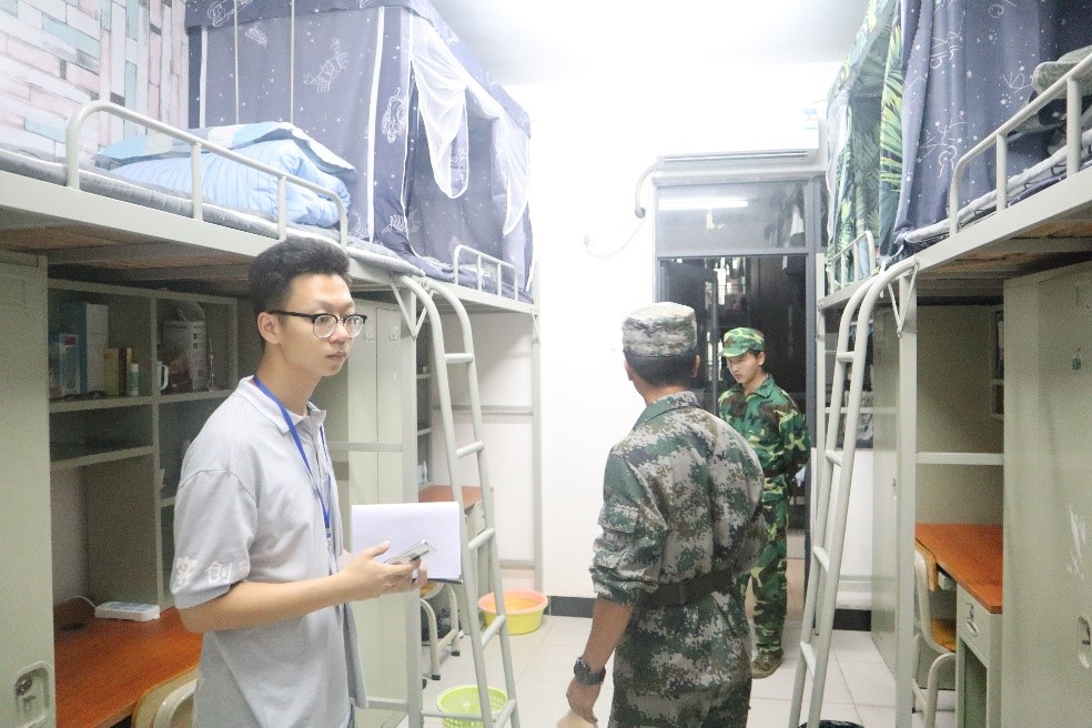 为了检查同学们军训期间宿舍内务的情况以及挑选优秀的学生宿舍进行表彰。11.14号晚,国际商学院学生工作办公室吴江六主任以及各个教官开展面向大一的宿舍检查工作,并根据宿舍的卫生清洁等情况进行严谨打分以及筛选优秀宿舍名单。