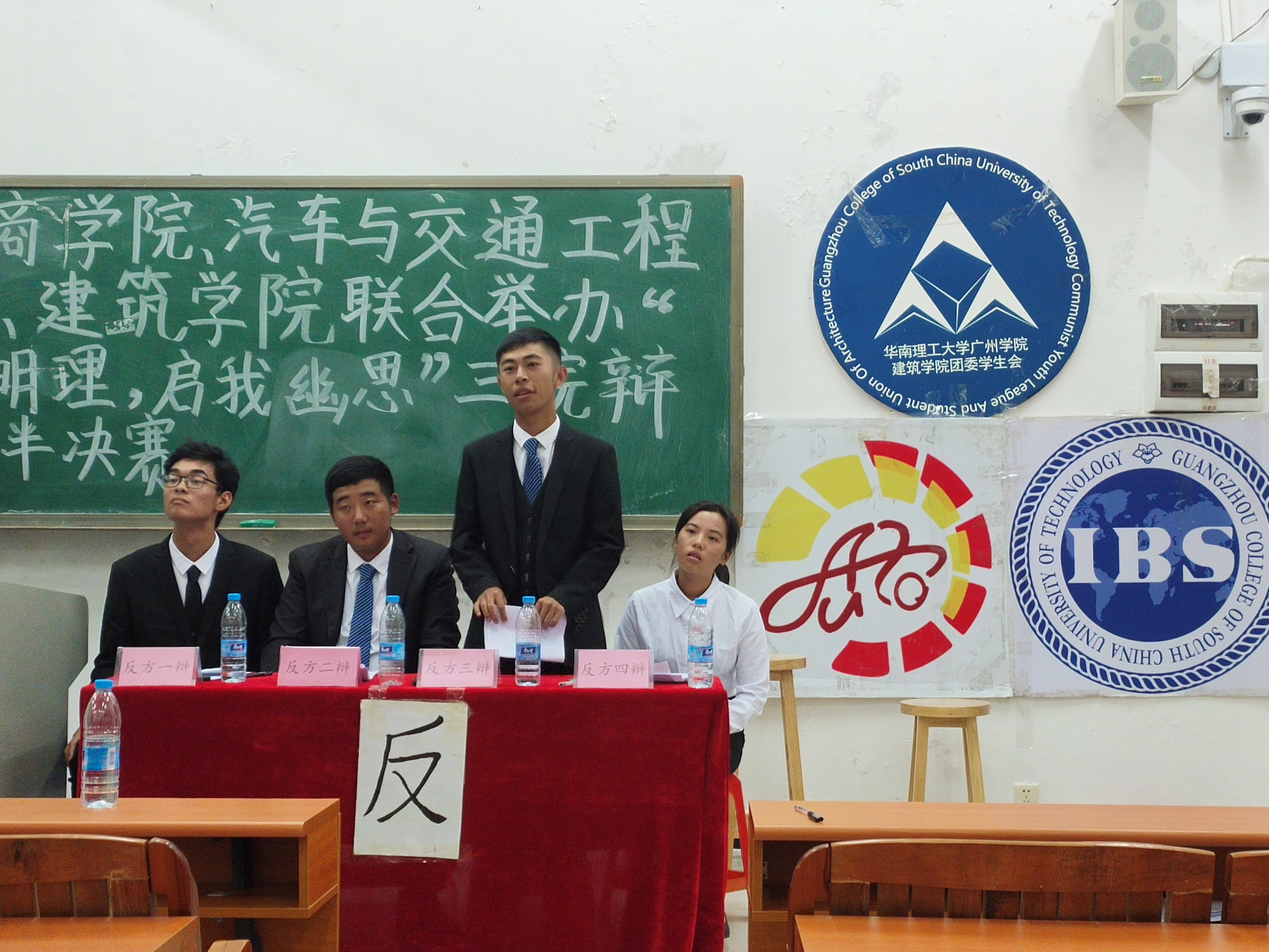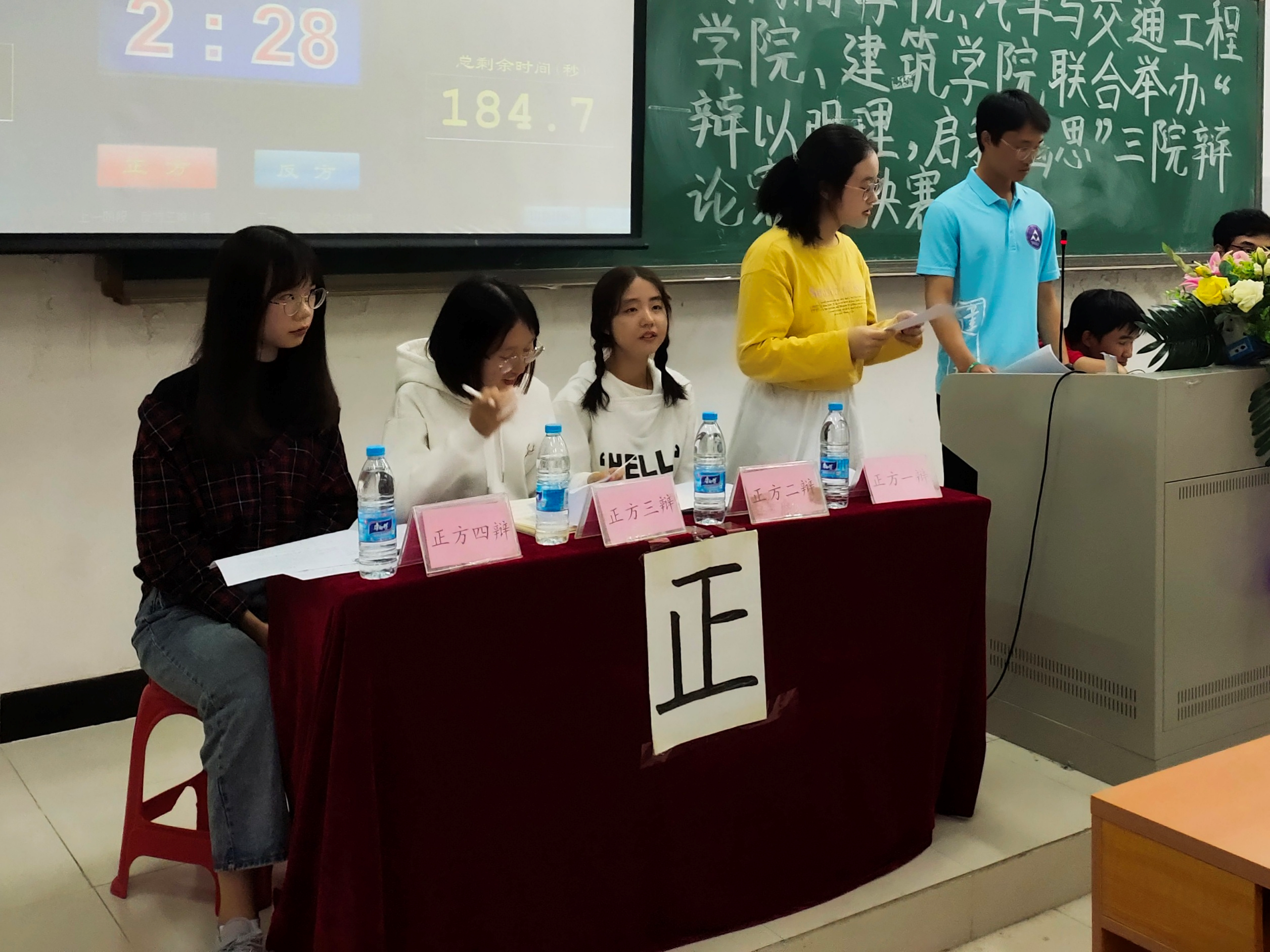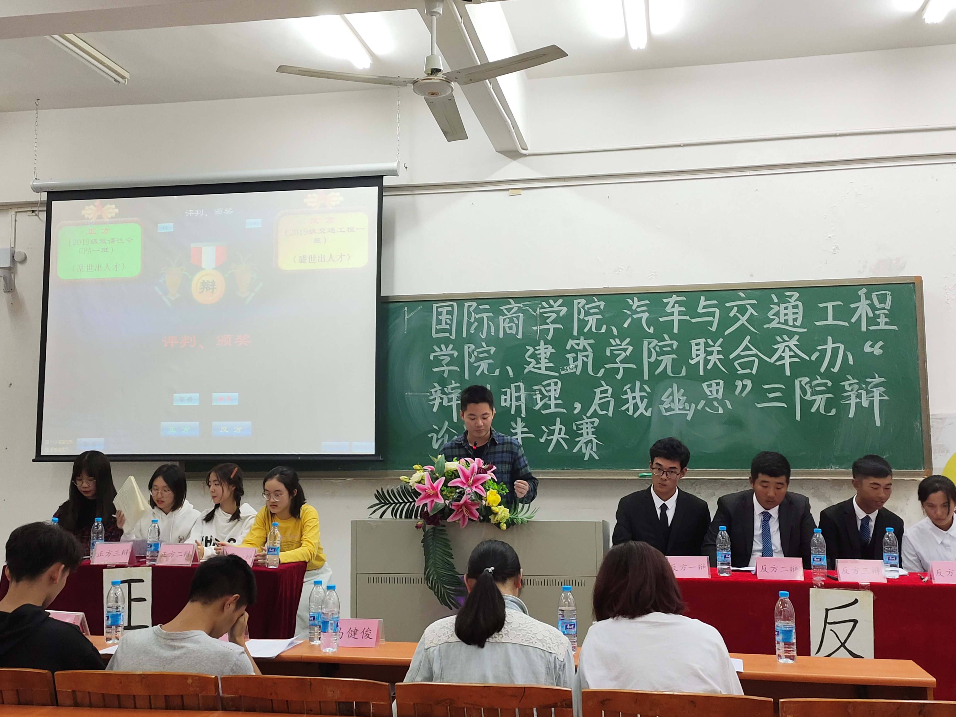 汽车与交通工程学院、国际商学院、建筑学院三院联合举办的“辩以明理,启我幽思”趣味辩论赛半决赛第一场于11月26日19:00在教室A5-202顺利举办。