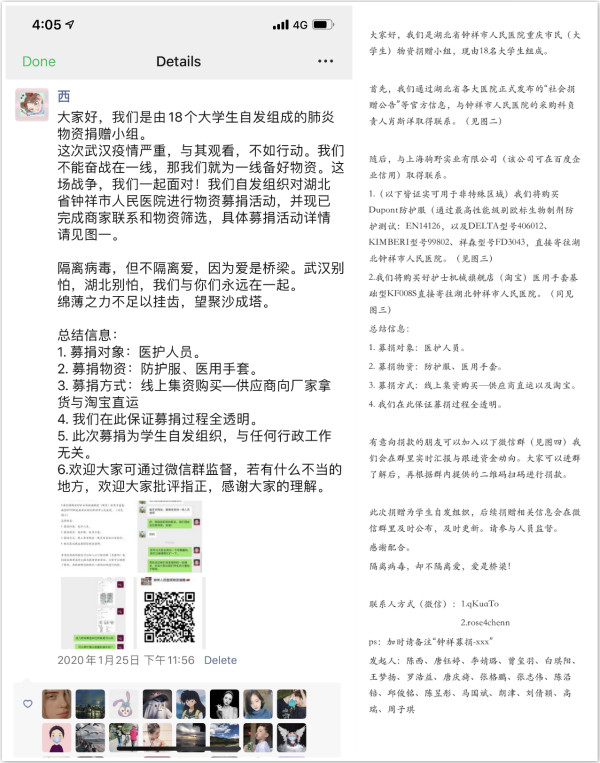 1月25日23:56,募捐小组的成员们开始在微信朋友圈和微博上发起募捐。为了便于向有意向捐款的人们解释详情、回复消息、款项登记等,他们建立了一个微信群,募捐小组的成员们在募捐期间轮流线上值班,及时回复热心捐款人士的咨询,保证捐款信息的公开透明。最重要的是,募捐小组成员收到的每一笔捐款都会认真地登记在册并及时公布。截至1月26日11:00,在短短的20小时里,募捐小组共收到款项共计22004.26元。当日下午,陈西他们又马不停蹄地采购了医用手套、防护服、口罩等救治一线的急缺物资寄送至捐赠目的地。