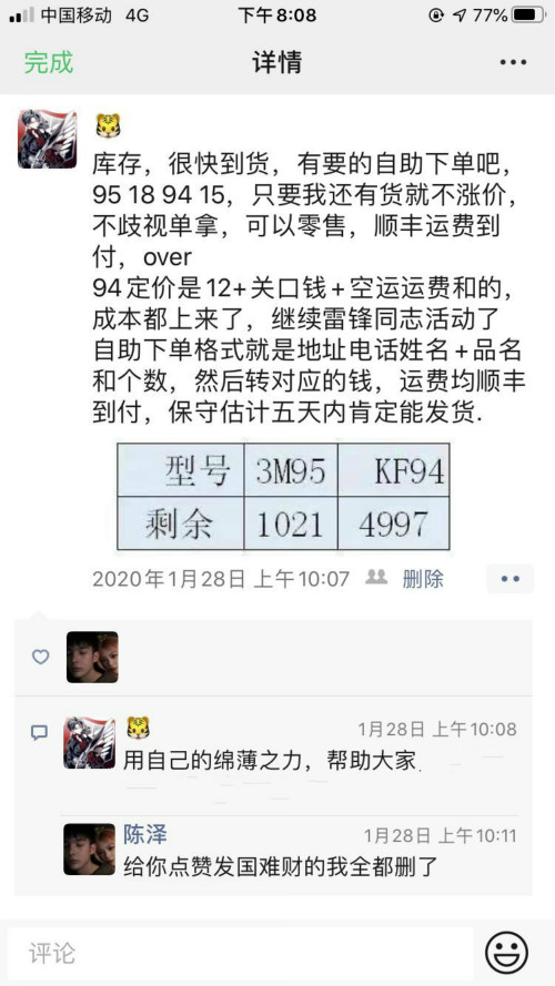 ”我希望通过做自己力所能及的事情,为打赢这场“抗疫战”尽一份绵薄之力!”抱有这种想法的来自国际商学院2017级投资学一班的刘时赫在疫情期间和几个朋友一起通过各种渠道千方百计从海外购入几千个口罩并按照成本价卖出。他在寒假开始时回到海南海花岛上的京东超市兼职,在那里他亲历了口罩被抢购一空,老百姓们“一罩难求“转而在微信朋友圈购入“天价口罩”。“在祖国需要的时候贡献自己的力量是当代大学生们的使命和担当。”刘时赫说到。