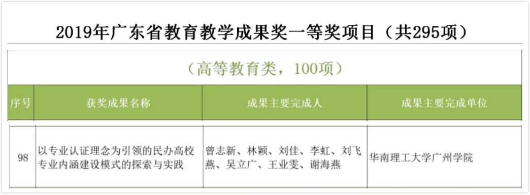 本网讯(记者 谢海燕)3月12日,广东省教育厅公布了2019年广东省教育教学成果奖获奖项目,我校常务副校长曾志新教授申报的成果《以专业认证理念为引领的民办高校专业内涵建设模式的探索与实践》荣获高等教育广东省教育教学成果奖一等奖。这是我校连续第三次荣获广东省教学成果奖,也是首次荣获一等奖。我院院长吴立广教授也是申报组成员之一。