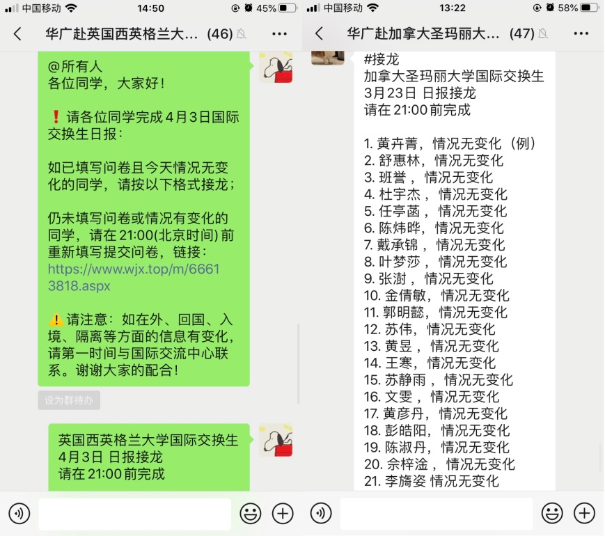 我校在各双学位合作项目微信群启动健康日报(黄卉菁 提供)
