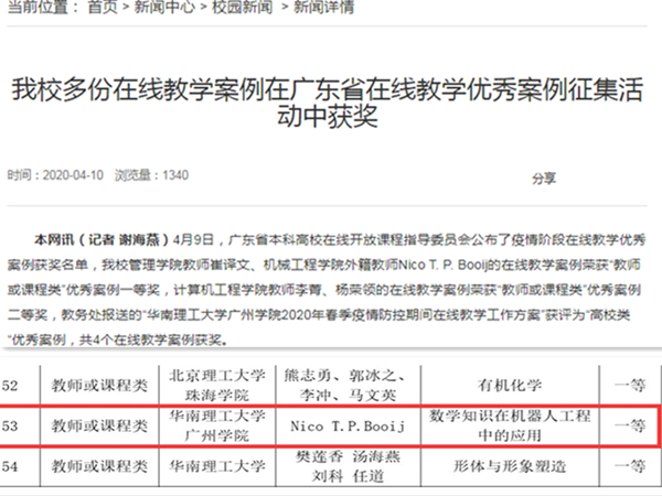 文中提及:“Nico T. P. Booij的在线教学案例《数学知识在机器人工程中的应用》利用在线平台进行全英授课,教学内容深入浅出,课程在线作业和评价系统很有特色,深受学生欢迎。”而Nico的这份基于数字化教学理念的线上授课案例最终荣获的是“教师或课程类”优秀案例一等奖。据悉,本届在校教学优秀案例第一、二批次共有1500余份案例参评,最终419份案例获奖。其中有外籍教师参与的获奖案例仅两份,而Nico是唯一一位独自负责案例课程的外籍教师,也是我校第一位因教学而获省级奖项殊荣的外籍教师。当获奖的消息转达给Nico的时候,相较于惊喜,他更多的是对学生的感谢和对疫情期间同学们坚持学习精神的感动。