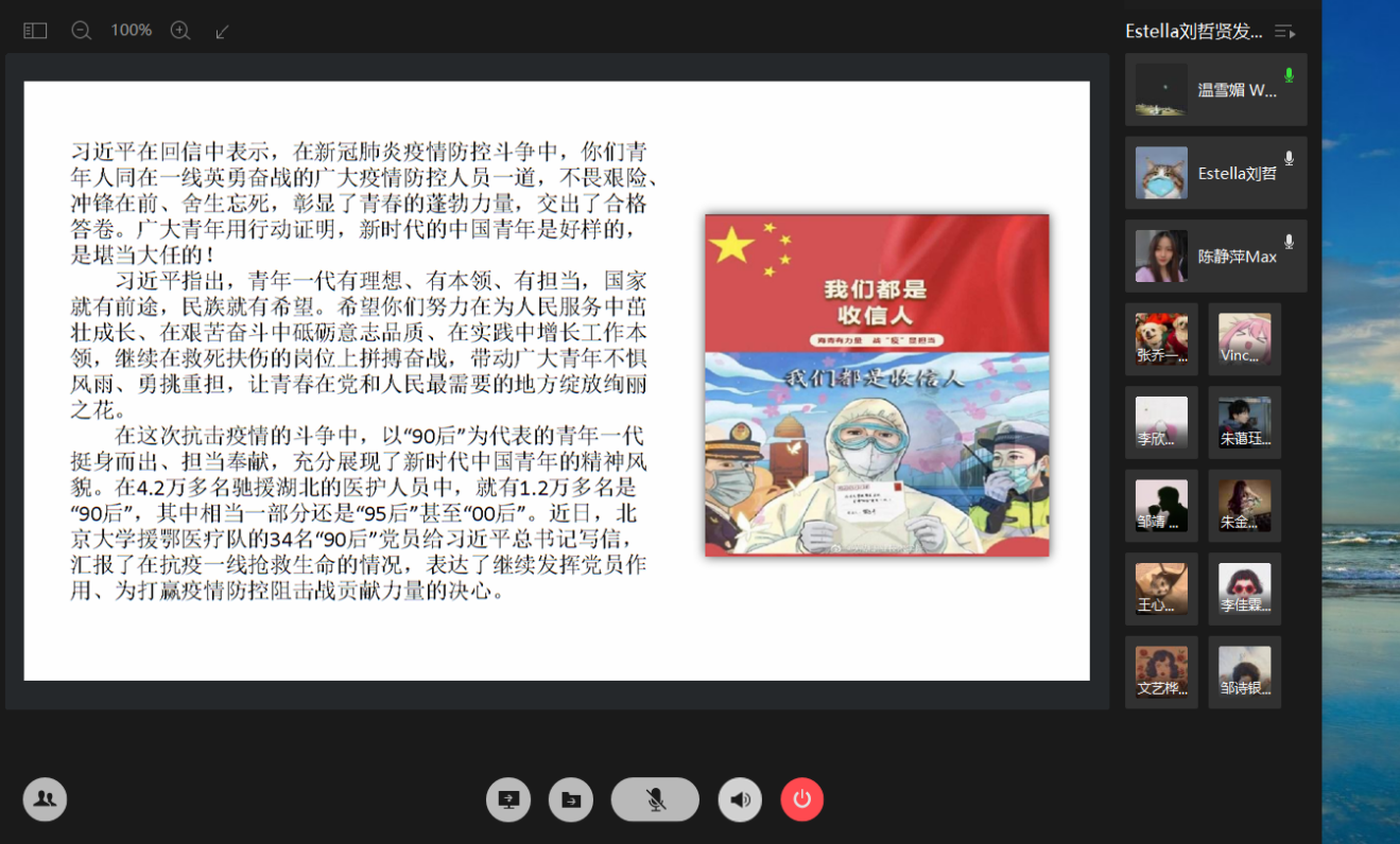 本次主题班会采用线上方式开展,各班运用腾讯企业微信、QQ群等软件进行。会上,同学们认真阅读习近平总书记给北京大学援鄂医疗队“90”后党员的信件全文,对抗击疫情的医生们无私奉献的精神表示敬佩。同时通过此次班会,学生们对自身的时代使命有了更深的认识,更加坚定前进的脚步,更好的平衡心态,在家上好网课,完成学业,为自己积蓄能量。