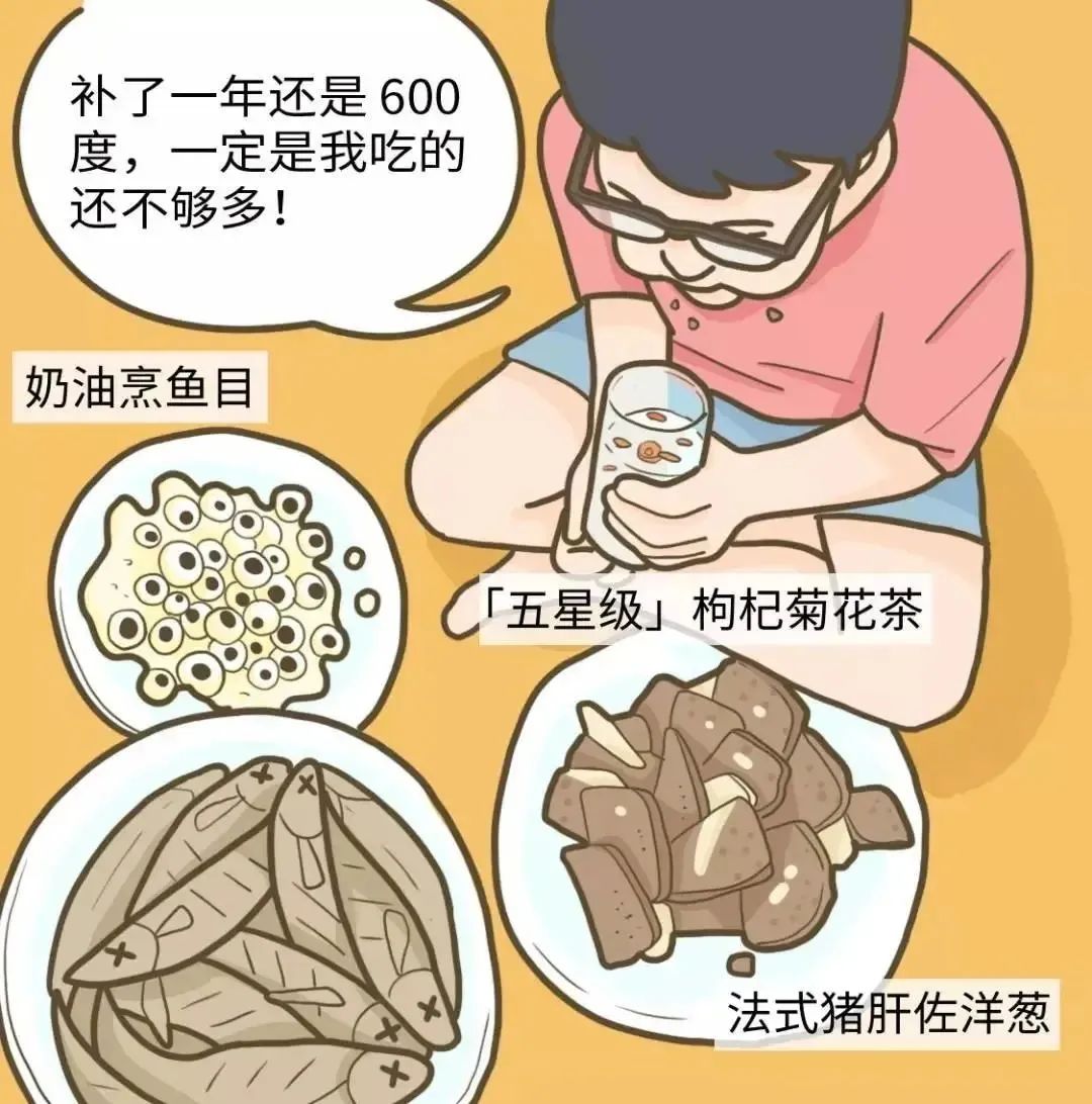 “猪肝明目”的说法是因为猪肝富含维A,有助于预防因缺乏维生素 A 患上干眼症和夜盲症。但是吃猪肝并不能缓解视疲劳,更别说改善近视了。鱼眼中除了水和脂肪,剩下的也就是少量的维生素 A 及 DHA,所谓“吃什么补什么”,只是个心理安慰。枸杞中含有有益视力的叶黄素,但含量甚少,所以想要通过吃枸杞来改善视力、缓解视疲劳,作用不大,也无法从根本上解决问题。