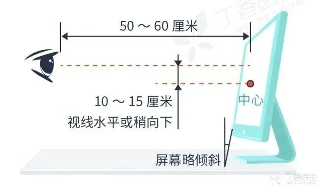 使用电脑时,眼睛与电脑屏幕距离保持在半米左右,电脑屏幕略倾斜,电脑的中心点在眼睛下方15cm左右。