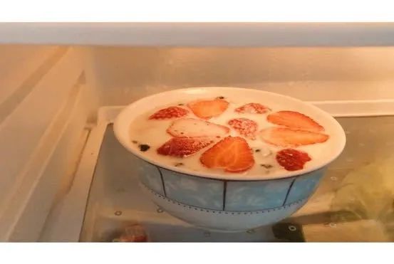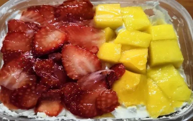 准备芒果、草莓、淡奶油,将芒果和草莓切丁,打发淡奶油,将淡奶油铺在盒子底部,然后铺一层芒果、草莓,再铺一层奶油,由此重复两遍,简单的“水果盒子”就做成了——17国贸6班 林锦凤