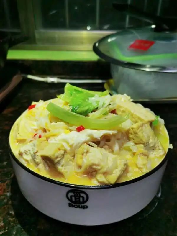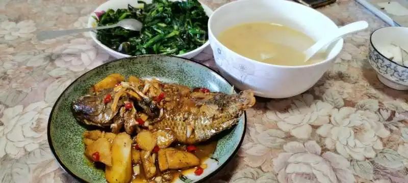 新鲜出炉的焖鱼,鱼汤,炒韭菜