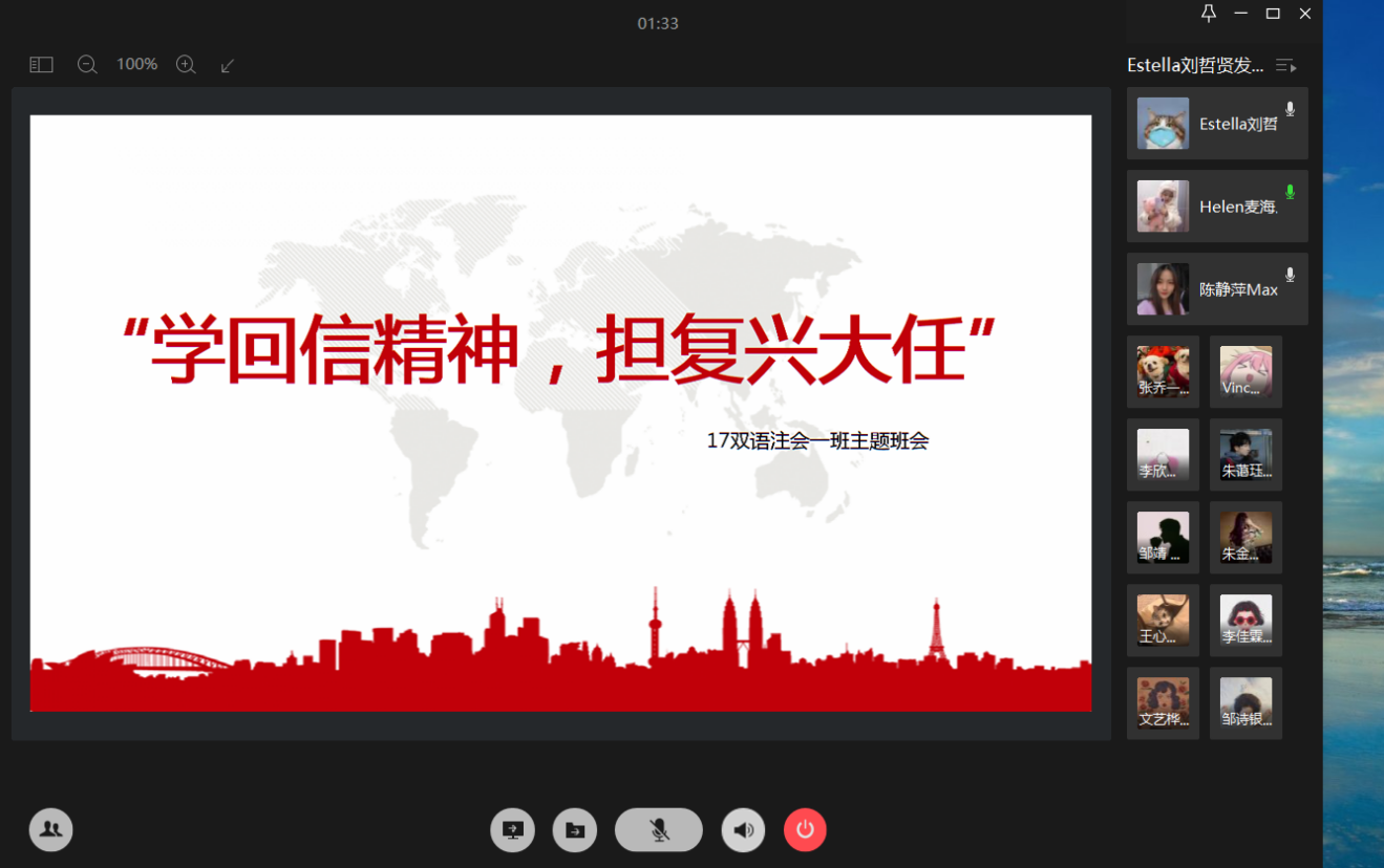 本网讯(记者 庄祉祎) 为深入学习贯彻习近平总书记给北京大学援鄂医疗队“90”后党员重要回信精神,推动形成大学习、大讨论、大实践的活动态势,国际商学院应学校的要求与5月2日组织各班开展“以学回信精神,担复兴大任”为主题的云班会。深入学习习近平总书记重要回信精神,结合当前形势,引导学生深刻理解核心要义和精神内涵。