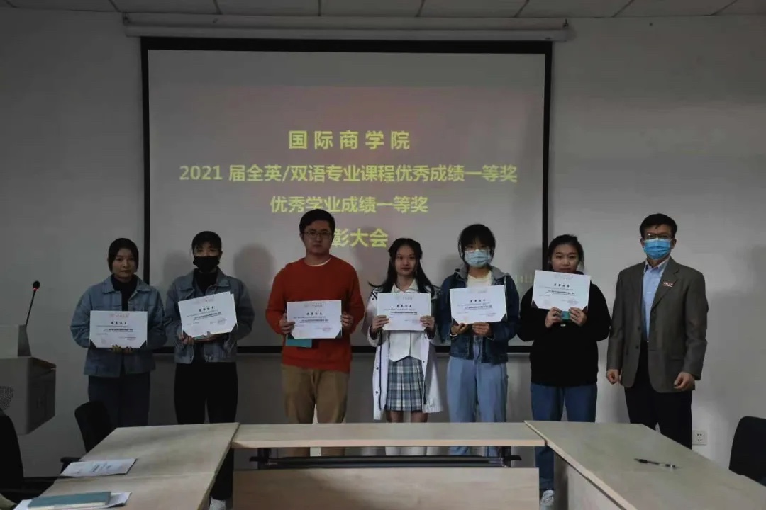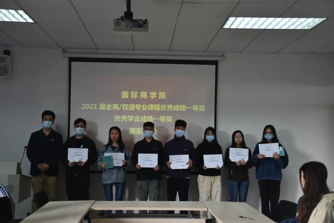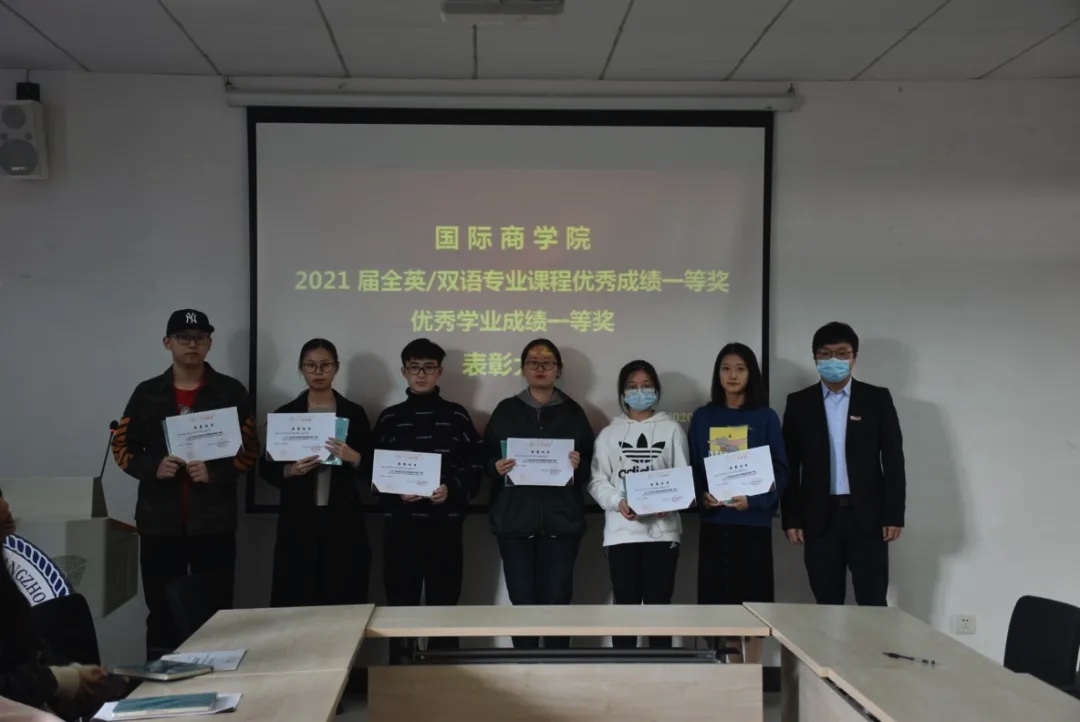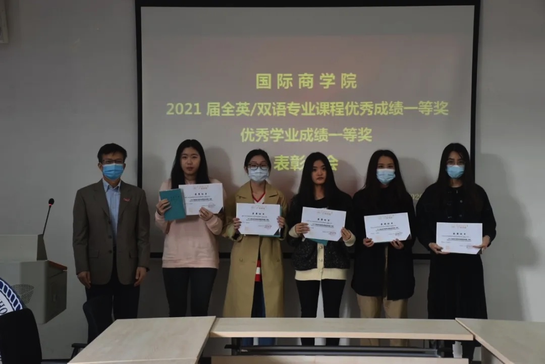 吴立广老师为国际经济与贸易专业(国际班)和国际经济与贸易专业(双语班)获奖的同学颁发获奖证书和纪念品。
