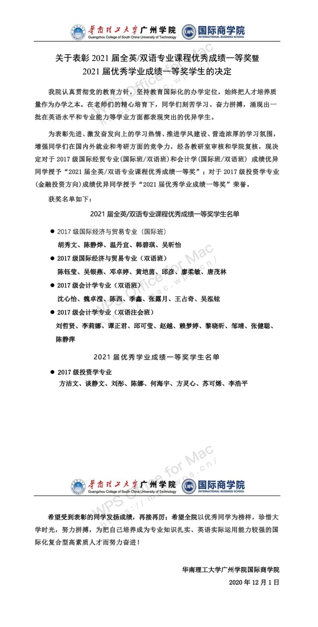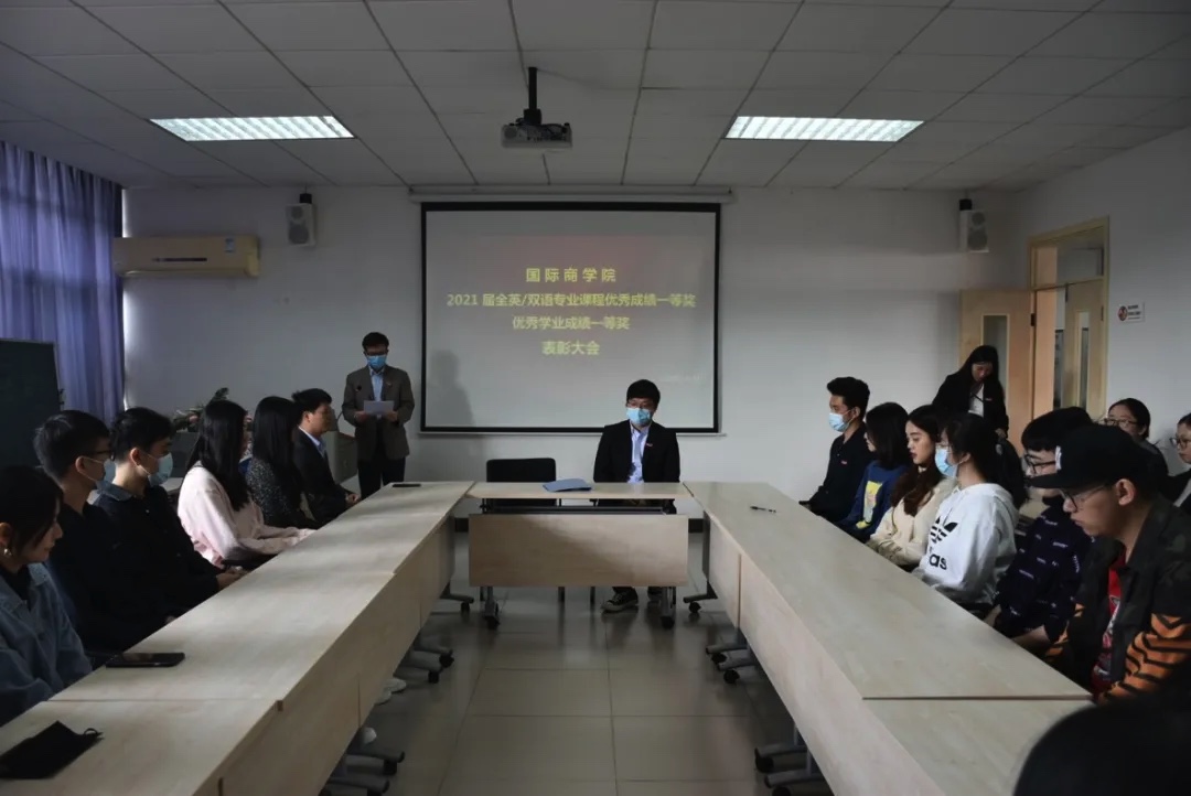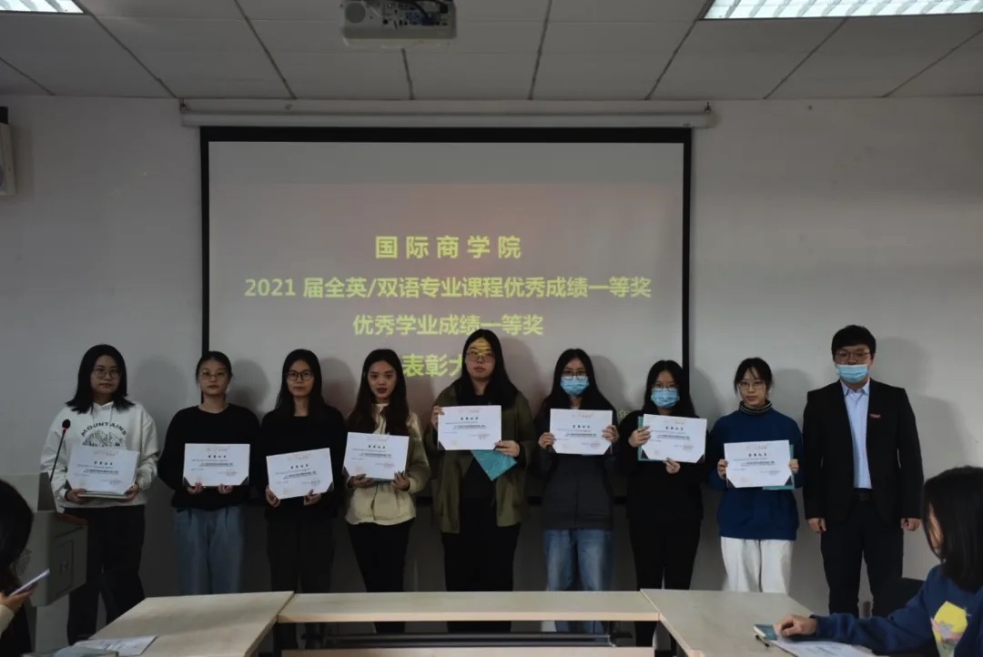 吴立广院长宣读表彰决定,对会计学(双语班)沈心怡等7名同学,会计学(双语注会班)刘伯贤等10名同学,国际经济与贸易(国际班)胡秀文等5名同学,国际经济与贸易(双语班)陈钰滢等7名同学,投资学方洁文等8名同学表示衷心地祝贺,希望他们能够再接再厉,志存高远,梦想成真。同时也希望其他同学以他们为榜样,努力拼搏,扎实专业知识,不断学习英语,提高英语能力。