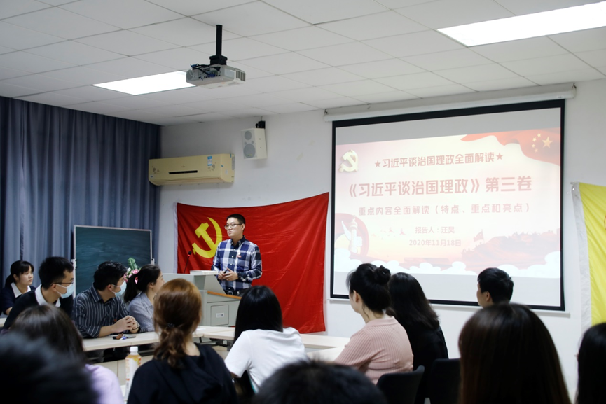 11月18日,国际商学院党总支书记汪昊向各位党员、发展对象开展主题宣讲会,全面解读《习近平谈治国理》第三卷,包括其特点,重点和亮点,理解十个“更加聚焦”,第三卷的核心要义、思想精髓及其内在逻辑,了解其实质,以及学习贯彻落实要求,做到“真学,真懂,真信,真用”。并以喜闻乐见的形式,生动地讲述了 “撸起袖子加油干”、“听民声、察民情、解民忧”、“身体力行,率先垂范”的三个“空谈误国,实干兴邦”的故事,希望通过事例型资料来学习,以使理论更好理解贯穿。党课结束后,同志们更加坚定民族复兴理想信念,强化责任担当,开拓创新,锐意进取。