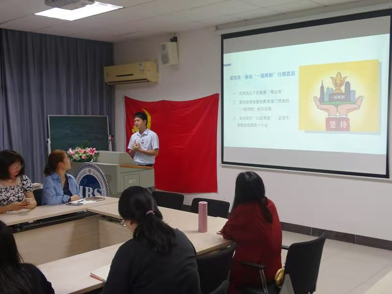 11月20日,国际商学院党总支副书记吴江六开展推动“一国两制”行稳致远的主题宣讲会,对"一国两制"的历史意义进行基础性讲解。并通过风雨洗礼下的香港"再出发"、更加自信地推进具有澳门特色的"一国两制"成功实践、坚决反对"以疫谋独",坚定不移推动祖国统一大业三大主题针对香港、澳门、台湾三地时事政治进行讲解。讲座尾声,吴江六副书记告诫青年大学生时刻警惕"颜色革命"等反动信息行为,鼓励青年为推动祖国和平统一。