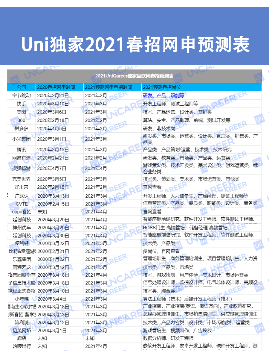互联网行业,大部分企业会在秋招将所有的岗位放出,如未招满也会直接在秋招末期进行补录,春招的岗位较少且不会大规模宣传。