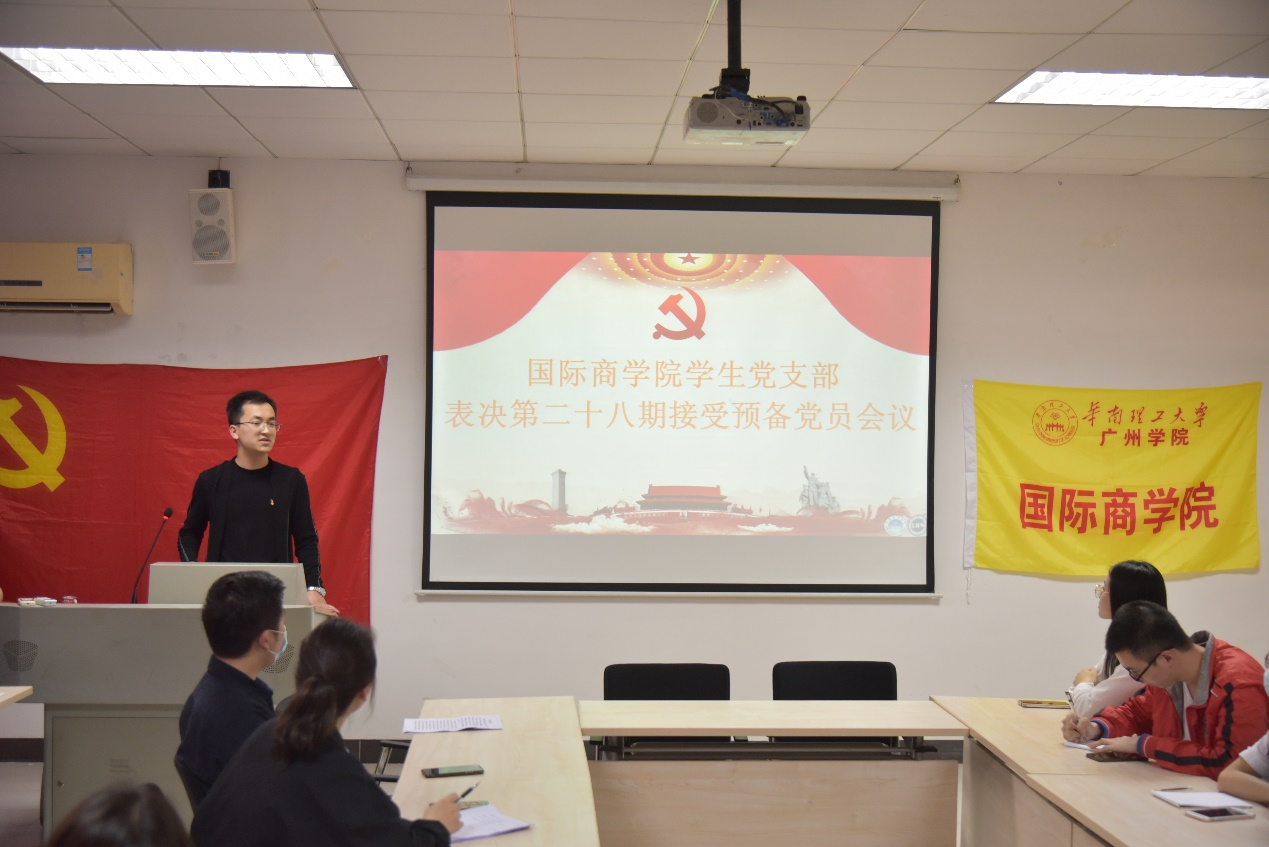 本网讯(记者 杨琴)2021年3月26日下午17点40分,国际商学院学生党支部在学校A6-505召开了表决第二十八期接受发展对象会议(针对2017级同学),讨论表决关于方洁文等同志为发展对象的事宜。出席本次会议的有国际商学院学生党支部书记庄祉祎老师、辅导员杨海圳老师以及学生党支部正式党员、预备党员共28人参会,由于部分学生党员同志在外实习,本次会议为线上视频与线下共同举行。会议由甄诚同志主持。