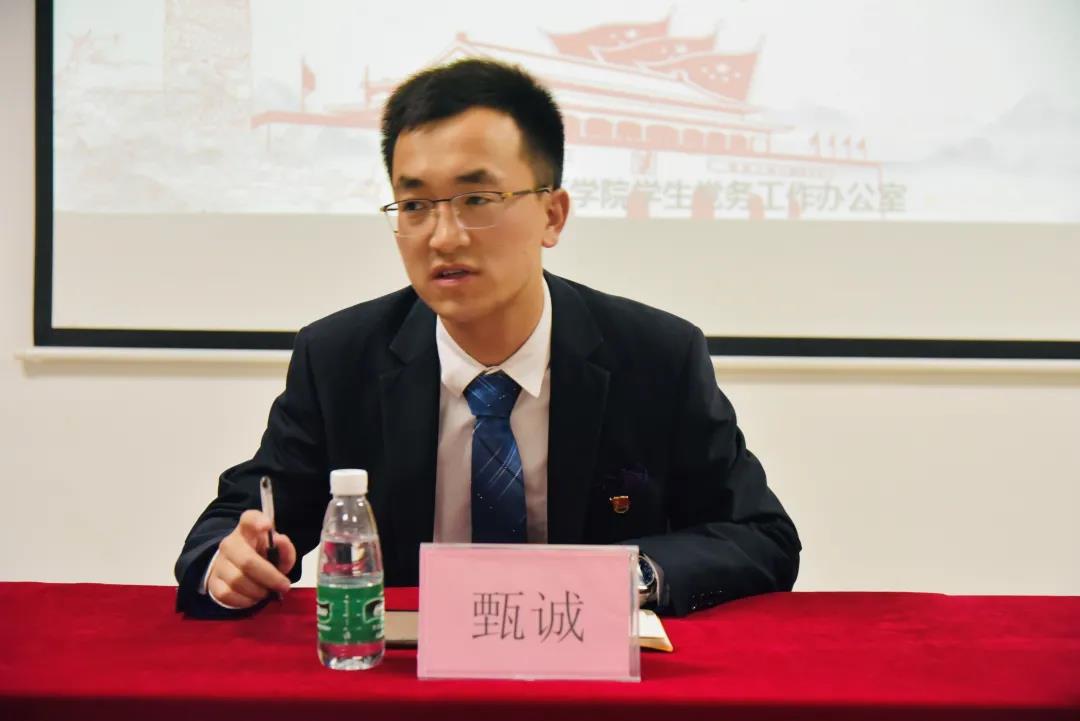 会议伊始,国际商学院学生党支部组织委员、学生党务工作办公室主任甄诚同志提到:学生党务工作办公室成员要以党员的标准严格要求自己,要对党的工作有热情,保持阳光心态,展现青春风采;要提升自我能力,加强文化修养。作为学生党务工作办公室成员要有高尚的道德情操,严谨踏实的工作精神;要加强执行力,在抓落实上下功夫;各部门要不折不扣贯彻上级部署;要讲正气、知礼仪、修涵养、懂感恩;要规范党员选拔流程,坚决防范和打击在党员选拔中走后门、拉关系的情况,确保党员发展流程公平公正公开,把好党员选拔的第一道关;要规范党务文件的书写和归档,妥善保管有关档案要加强党史宣传力度,要加强学院公众号和学院官网党建专栏建设。