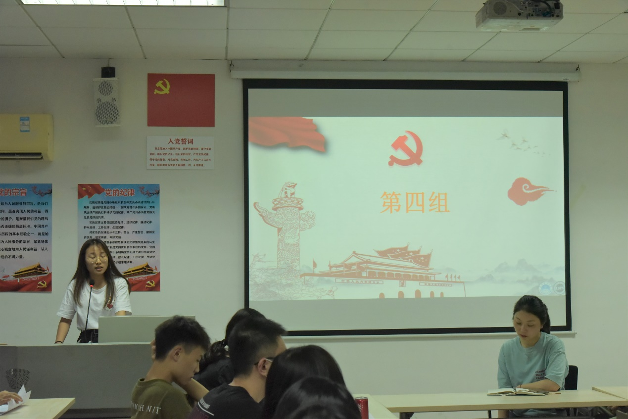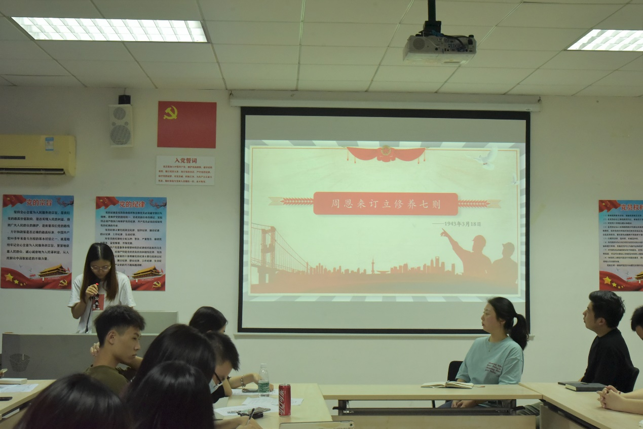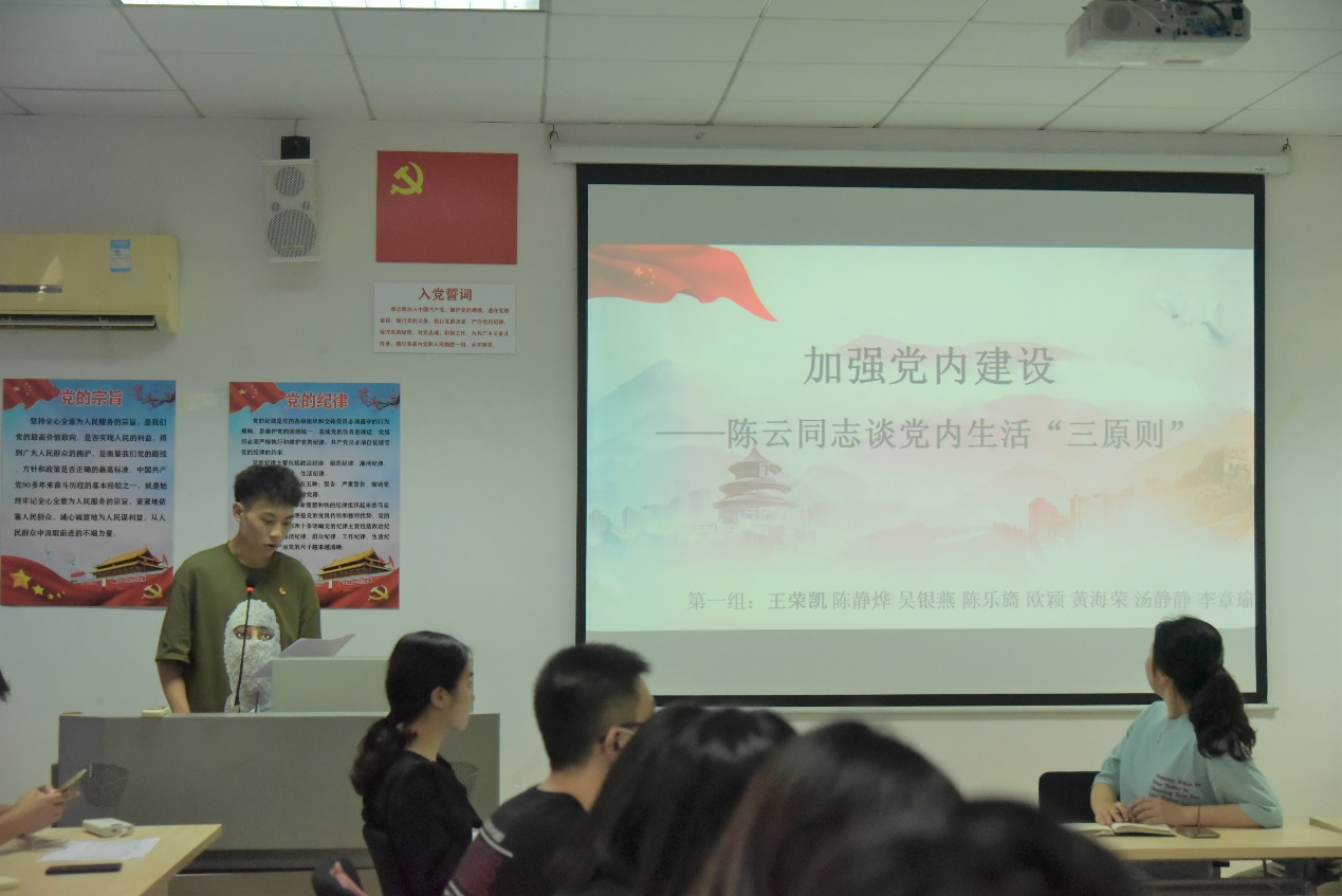 第一组分享的主题是:加强党内建设-陈云同志谈党内生活“三原则”。他们小组对陈云同志的三原则:正面地坦率地明辨是非原则、严格执行民主集中制原则、坚持“四个服从”原则做分享,并谈到陈云同志的三原则对于我们现在党员同志们也极有意义,我们要时刻保持谦逊的态度,坚守严格的标准,互相监督学习,共同建设国际商学院的良好学风作风。