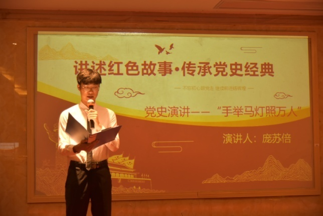 第三位选手是来自2018级投资学的庞苏倍同志他演讲的主题是“手举马灯照万人”