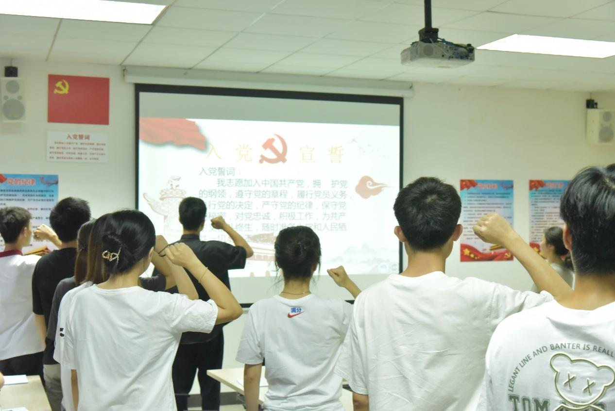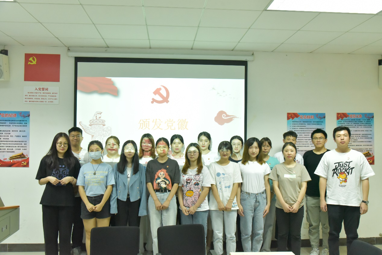 学生党支部书记庄祉祎老师、副书记杨海圳老师为中共预备党员颁发党徽。