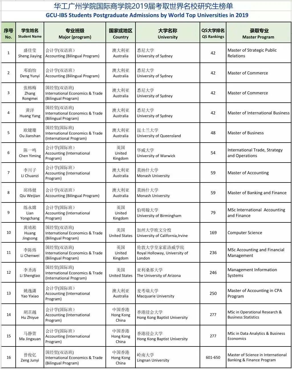 截止2019年6月中旬,2015级会计学专业(双语班)盛佳莹、2015级国际经济与贸易专业(国际班) 欧键珊等16名同学分别考入澳大利亚悉尼大学、澳大利亚莫纳什大学、英国华威大学、英国伯明翰大学、美国加州大学欧文分校等世界一流名校研究生,将在毕业后奔赴世界各地继续深造。