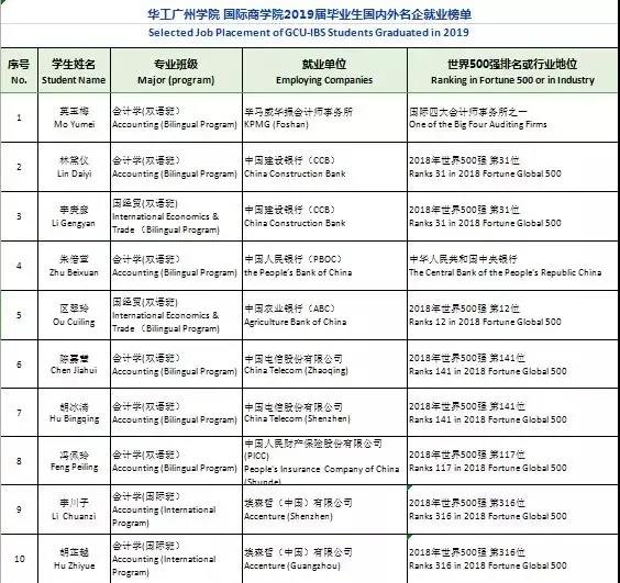 2019届毕业生就业质量继续提高,10多名毕业生成功应聘四大会计师事务所的毕马威会计师事务所、世界著名管理咨询公司埃森哲咨询公司、中国建设银行、中国电信、中国农业银行等世界500强企业。会计学专业(国际班)胡芷越等优秀学生同时拿到世界名校研究生录取通知书和世界名企工作offer。