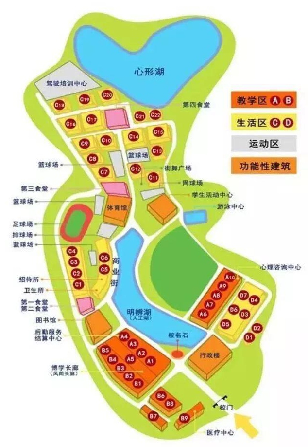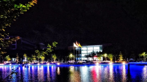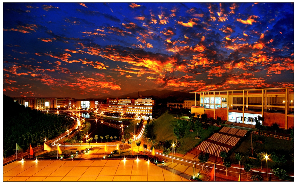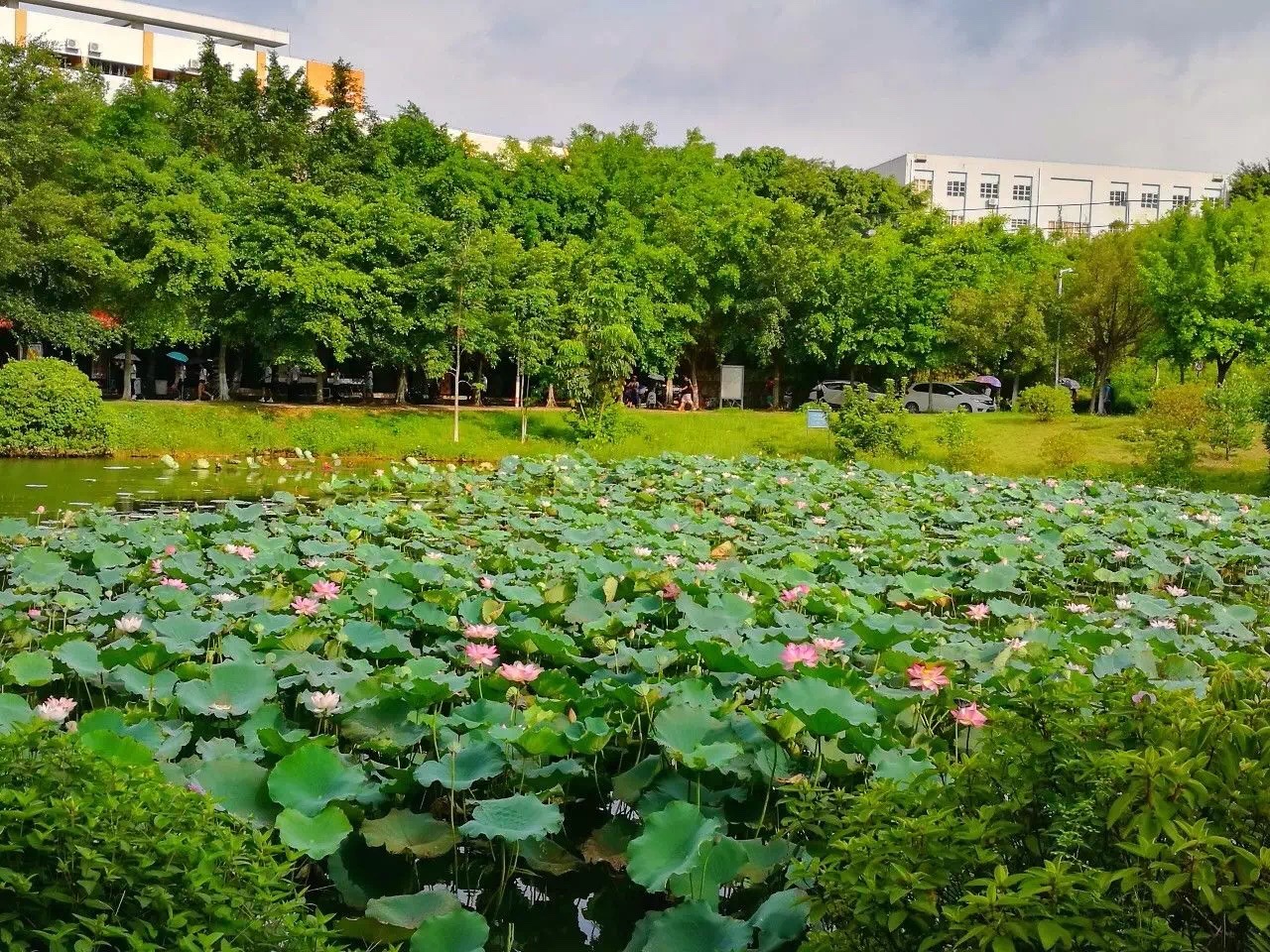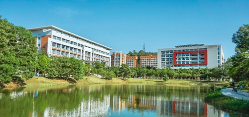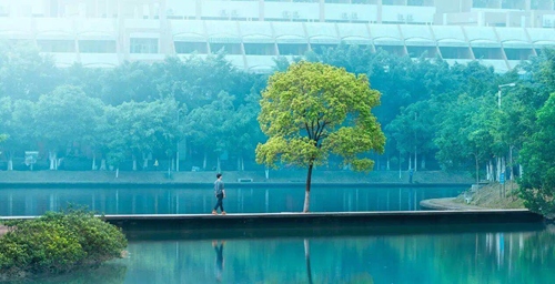 苍翠中的校名石人工湖旁的A6就是国际商学院夏季的人工湖荷花盛开夜晚的人工湖流光溢彩教学楼清晨的教室宁静而美好,在这里开始一天的学习吧图书馆也是我们的好去处宿舍区,我们在大学里的家蓝天白云学习了一天,来球场运动一下吧华广的清晨