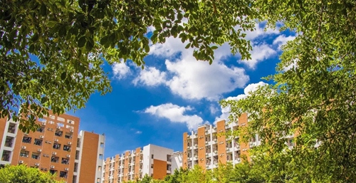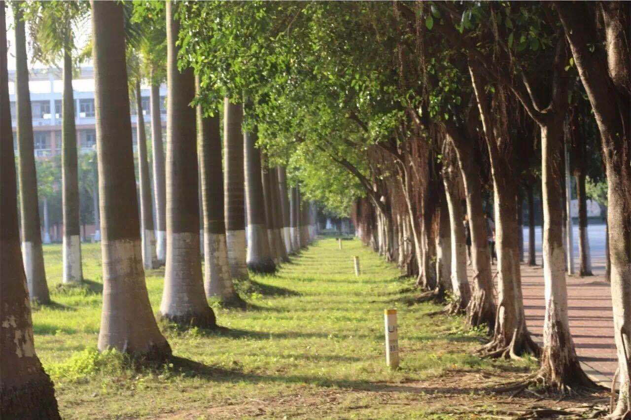 雄伟的校门穿过林荫校道“一站式服务”行政楼