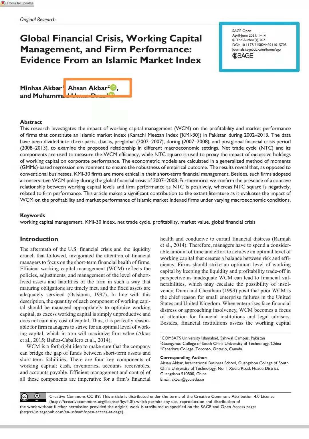 SAGE Open》 发表论文 “Global Financial Crisis, Working Capital Management, and Firm Performance: Evidence From an Islamic Market Index”。