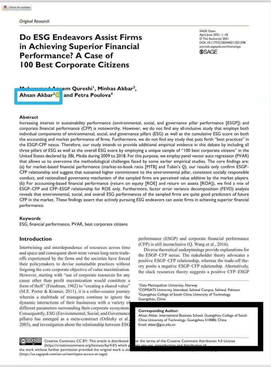 SAGE Open》发表论文 “Do ESG Endeavors Assist Firms in Achieving Superior Financial Performance? A Case of 100 Best Corporate Citizens”。这是Akbar副教授2021年度发表的第四篇SSCI国际杂志论文。