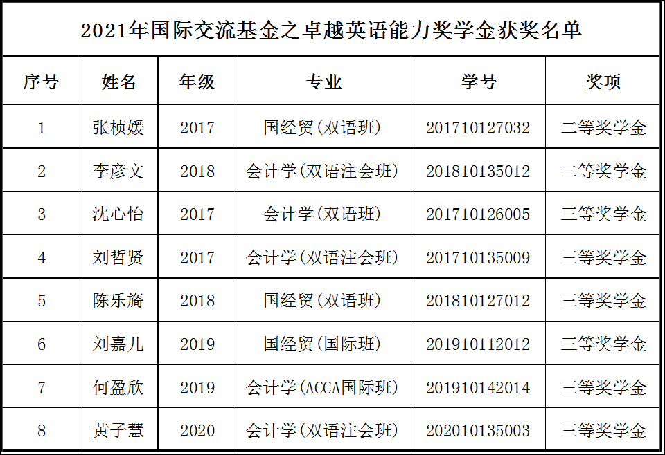 关于公布我院2021年“国际交流基金之卓越英语能力奖学金”获奖名单的通知