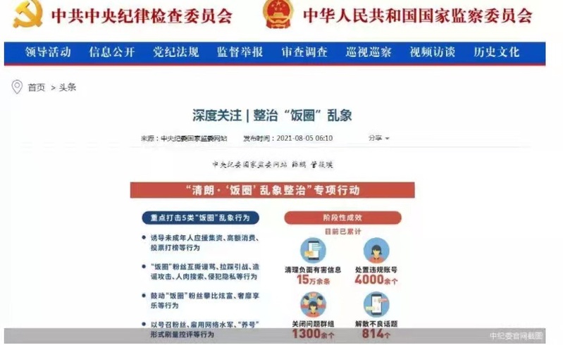 继中央网信办、国家广播电视总局纷纷出手后,8月5日,中纪委通过官方网站发布名为《深度关注|整治“饭圈”乱象》的文章,点名“吴亦凡事件”,直指不良粉丝文化已经到了非整治不可的紧要时刻。