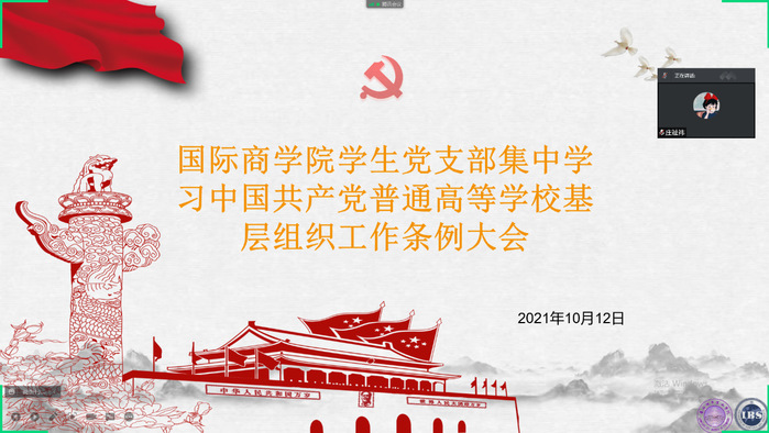 本网讯(记者 黄巧怡)为了深入贯彻习近平新时代中国特色社会主义思想,全面、准确把握新时代对高校基层党建工作的新要求,切实推进高校基层党建工作取得新成效,国际商学院学生党支部于10月12日下午6时,通过线上会议的形式开展以《中国共产党普通高等学校基层组织工作条例》(以下简称《条例》)为内容的学习。国际商学院学生党支部书记庄祉祎担任主讲人,学生党支部党员及学生党务工作办公室成员共45人参加了本次学习。
