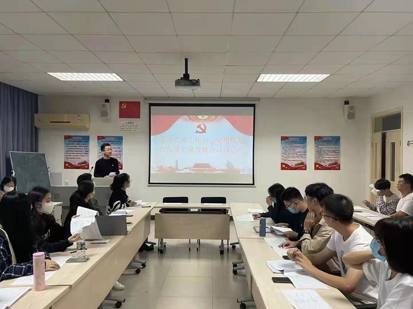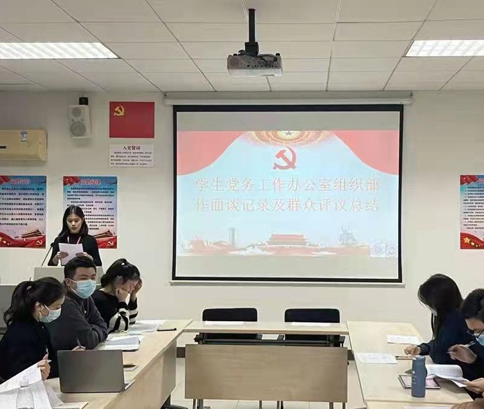 会议伊始,由学生党务工作办公室组织部工作人员黄巧怡、陈奕谕分别作面谈记录总结和群众评议情况汇报。
