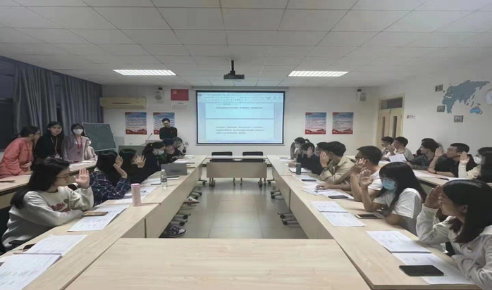 本网讯(记者 李兆凤)发展对象的表决工作是发展党员工作一项重要环节,为了增强党组织的吸引力和凝聚力,达到激励党员纯洁组织整顿队伍的目的,2021年10月22日下午18时许,国际商学院学生党支部第二十九期发展对象表决会议在A6-505教室顺利召开。国际商学院学生党支部书记庄祉祎老师,学生党支部副书记杨海圳老师,21级新生辅导员黄少芬老师及国际商学院学生党支部学生党员共32人参加本次会议,由于部分学生党员同志在外实习,本次会议为线上视频与线下共同举行。由学生党支部组织委员、学生党务工作办公室主任甄诚同志主持会议。