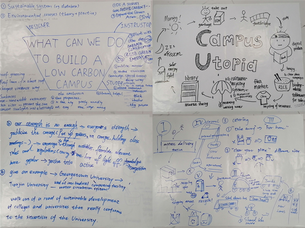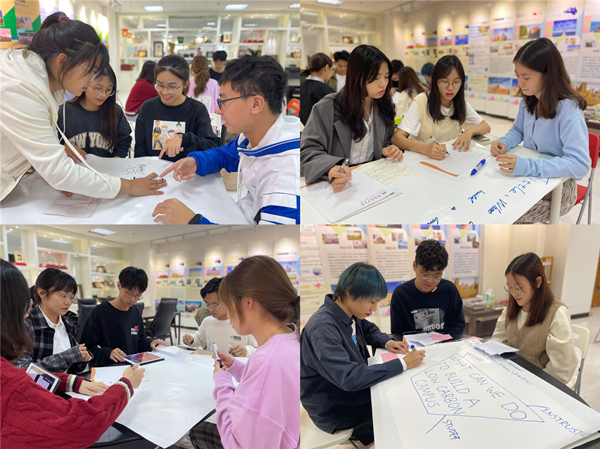 经过20分钟的精心准备,各组的设计方案各具特色、新颖有趣。有的从教学楼、快递站、食堂、校道等校园基础设施设计如何循环利用资源、减少污染排放;有的以“约翰在低碳校园的一天”,构筑了一个可持续、绿色的校园乌托邦;有的则从教师、学生、校园设计的角度分别呼吁我们作为在校园的一份子,应如何贡献自身的努力,助力建设低碳校园。在具体的举措方面,学生也是各抒己见,从水资源利用、新能源开发、校内交通管理、餐饮与快递垃圾分类、无纸化生活等多个角度阐释如何建设低碳校园。来自珠宝学院的学生李彩楠创想在教学楼楼顶设计屋顶花园、开发太阳能;来自管理学院的李鹏宇同学认为可整合校内现有二手物品交易渠道,建设规范的电子交易平台促进物资循环利用,减少浪费;“环保类的课程能培养学生的环保和低碳意识,每人每天做一点点,就能促进校园的可持续发展”,来自外国语学院的学生彭安琪则建议可在课程思政的基础上添加更多环保元素。