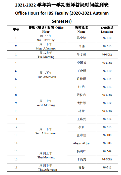 为做好2021-2022学年第一学期的教学工作,让同学们在新的学期学到更多的知识,取得更加优异的学习成绩,国际商学院的教师们将在不同的时间段为同学们解答疑问。现将教师答疑时间的安排通知如下,希望同学们仔细阅读,如有需要,可以在相应的时间和地点找教师进行答疑。