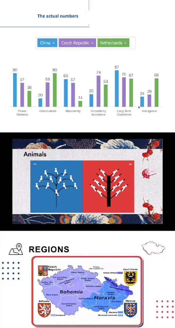 在跨文化工作坊中,三校的主讲老师的着重点各有特色。荷兰NHL Stenden侧重于当地文化的分享,主讲老师Koen以霍夫斯泰德文化维度理论为框架,从权力距离、个人或集体主义倾向、男性或女性偏向、不确定性规避、长期或短期取向、自身约束和放纵倾向6个维度对中荷捷三国的社会文化进行了比较。捷克MVSO着重以视频形式分别介绍了捷克整体的风土人情、首都布拉格、学校所在城市奥洛穆茨、以及捷克的传统舞蹈Verbunk Dance。我校外国语学院的蒋梦菲老师以图片展示方式声情并茂地讲解了中西方文化的异同之处,她还以饮食文化为切入点,向中外朋友介绍了别具特色的广府传统文化。