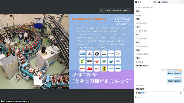 讲座之后,英国哈德斯菲尔德大学广州办公室代表Kate He详细介绍了英校概况,如对接专业、课程设置、校园环境、住宿条件、学杂费与奖学金政策等。她特别提到,哈德斯菲尔德大学是是全英五大提供“三明治课程/sandwich courses”的院校之一,此类课程为学术提供带签证和薪资的实习机会,深受学生欢迎。在疫情防控常态化阶段,赴英国留学的学生人数已有所回升,哈德斯菲尔德大学将继续为中国学生提供优质留学平台和渠道。