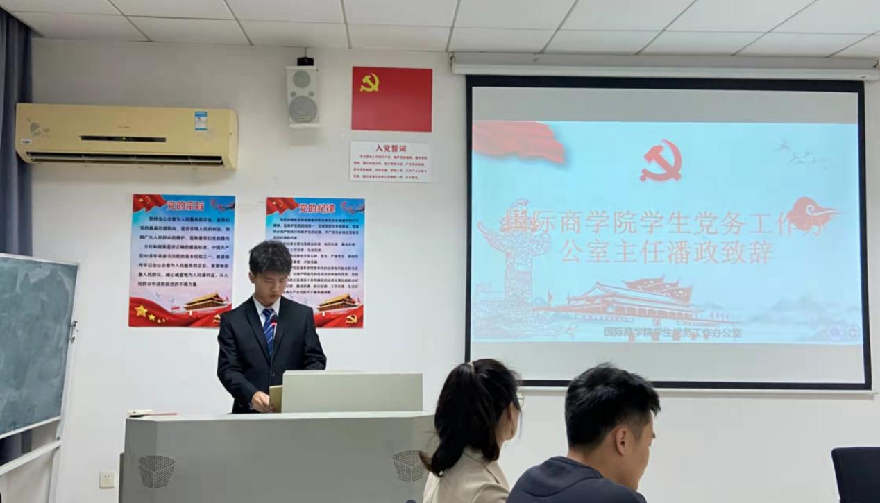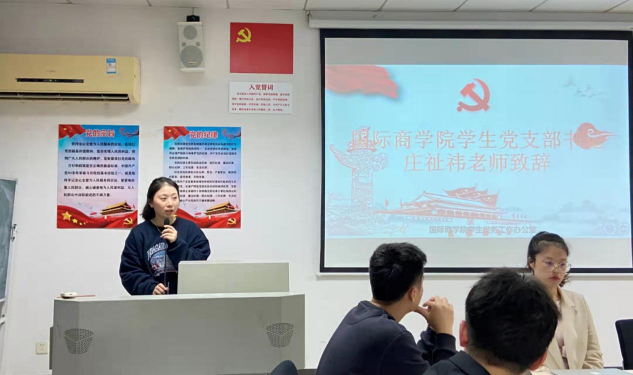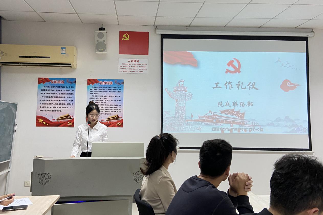 本网讯(记者 陈煜森)为进一步提升国际商学院党建工作质量和学生党务工作者的业务技能,促进我院学生党建工作更加规范化、制度化。11月19日晚,广州城市理工学院国际商学院学生党务工作办公室第一次全体大会于A6-505召开。本次会议共25人参会,学院学生党支部书记庄祉祎,辅导员黄少芬、就业专员黄增光出席了此次会议。