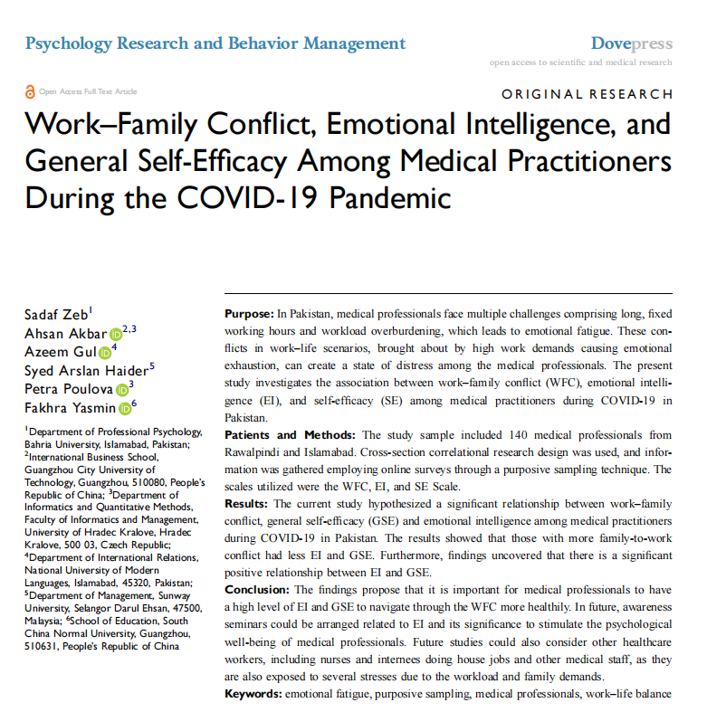 “Work–Family Conflict, Emotional Intelligence, and General Self-Efficacy Among Medical Practitioners During the COVID-19 Pandemic”本研究调查了巴基斯坦COVID-19期间医疗从业者的工作-家庭冲突(WFC)、情绪智力(EI)和自我效能(SE)之间的关系。研究样本包括140名来自拉瓦尔品第和伊斯兰堡的医疗专业人员。采用横截面相关研究设计,通过有目的的抽样技术通过在线调查收集信息。所用量表为WFC、EI和SE量表。研究结果显示,家庭与工作冲突愈严重的个体,其EI和GSE愈低。此外,研究还发现,智力水平与GSE之间存在显著的正相关关系。高水平的EI和GSE水平对医疗人员在WFC中更健康的导航至关重要。