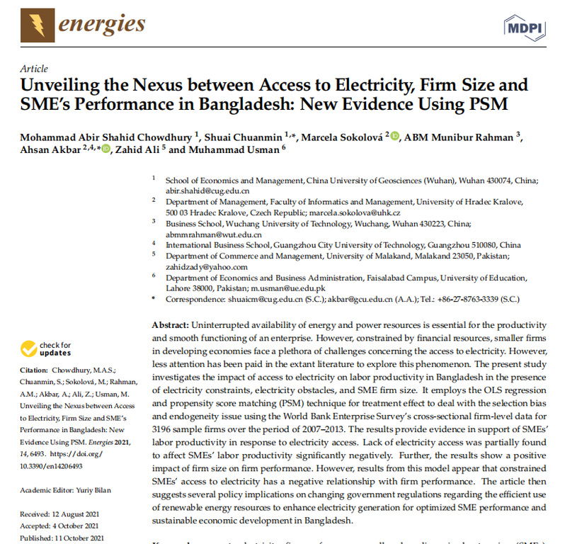 “Unveiling the Nexus between Access to Electricity, Firm Size and SME’s Performance in Bangladesh: New Evidence Using PSM” 本研究调查了在孟加拉国存在电力限制、电力障碍和中小企业规模的情况下,电力获取对劳动生产率的影响。它使用OLS回归和倾向得分匹配(PSM)技术来处理选择偏差和内生性问题,使用世界银行企业调查的2007-2013年期间3196家样本企业的横断面企业水平数据。研究结果为中小企业应对电力供应的劳动生产率提供了支持。电力供应不足对中小企业劳动生产率有部分显著负向影响。此外,研究结果表明,企业规模对企业绩效具有正向影响。然而,该模型的结果显示,受约束的中小企业获得电力与企业绩效具有负相关关系。