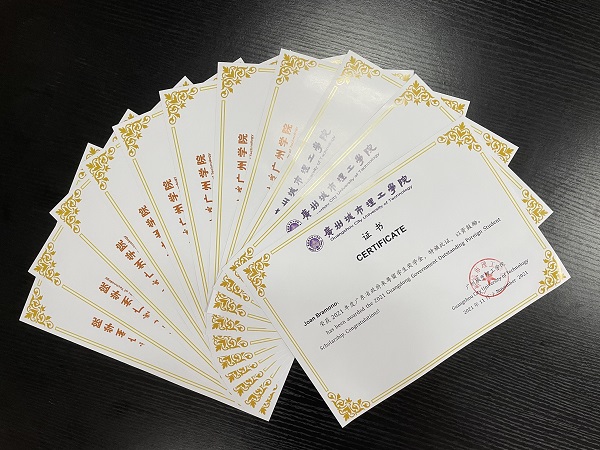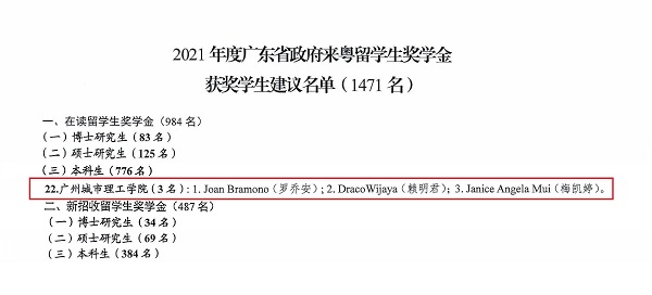 2021年,我校获得3个在读本科生奖学金名额,经学生个人申请、校内综合测评与推荐、广东省教育厅与广东省财政厅复核等程序,3名学生成功获奖,这也是我校连续第6年有国际学生获得此奖学金。